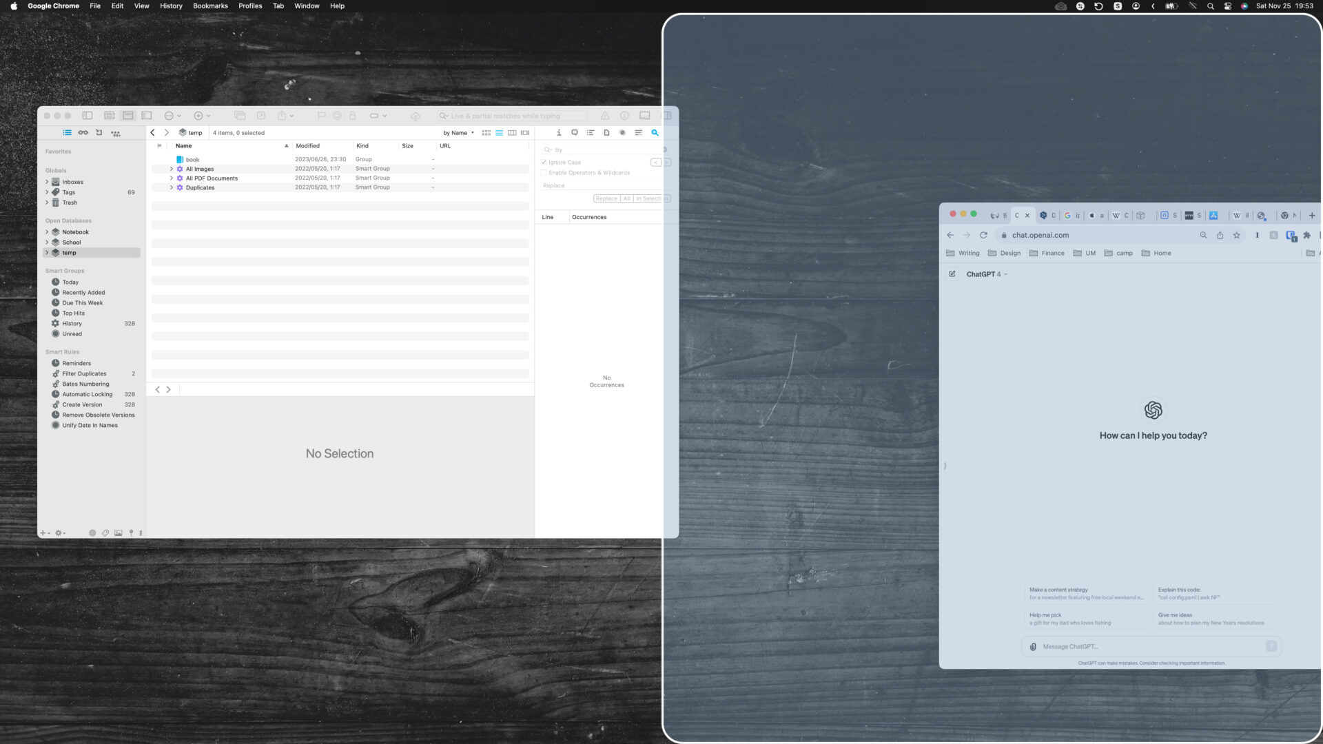 DEVONthinkのメイン画面。右側に今開いている文書と関連度の高いフォルダ・ドキュメントが勝手に出てくる。