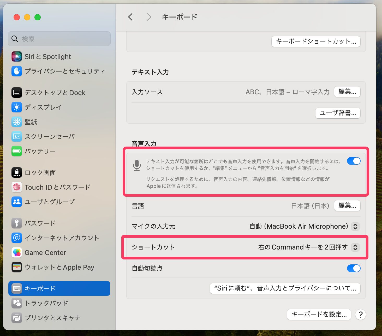 おすすめの設定は、Macの設定の「キーボード」の項にある「音声入力」をオンにして、音声入力モードを呼び出すショートカットとして右コマンドキーのダブルクリックを設定しておく方法だ。