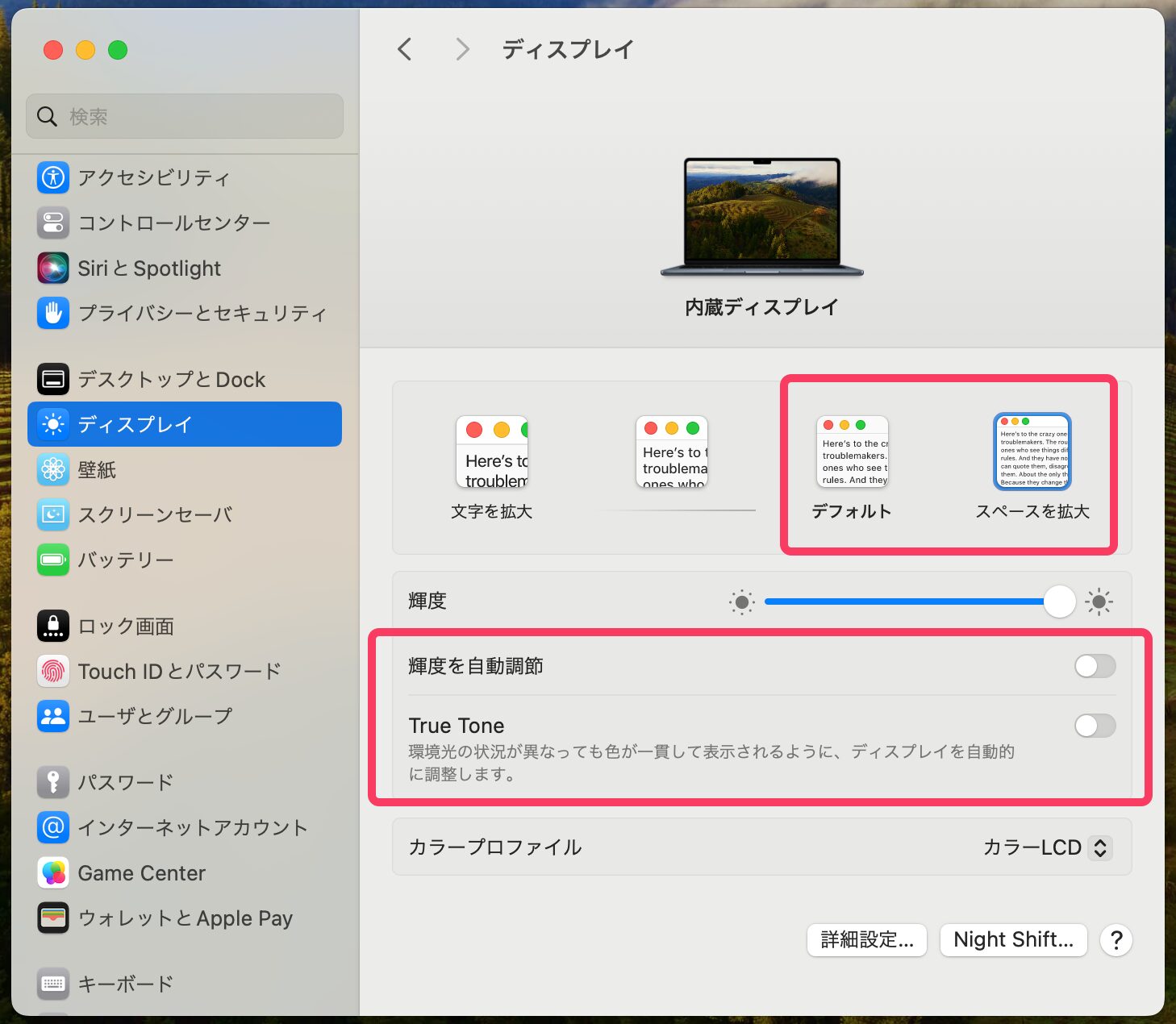 Macは、デフォルトでは、環境の明るさに応じて自動で画面が暗くなったり明るくなったり、画面が茶色っぽくなったり青白っぽくなったりする。