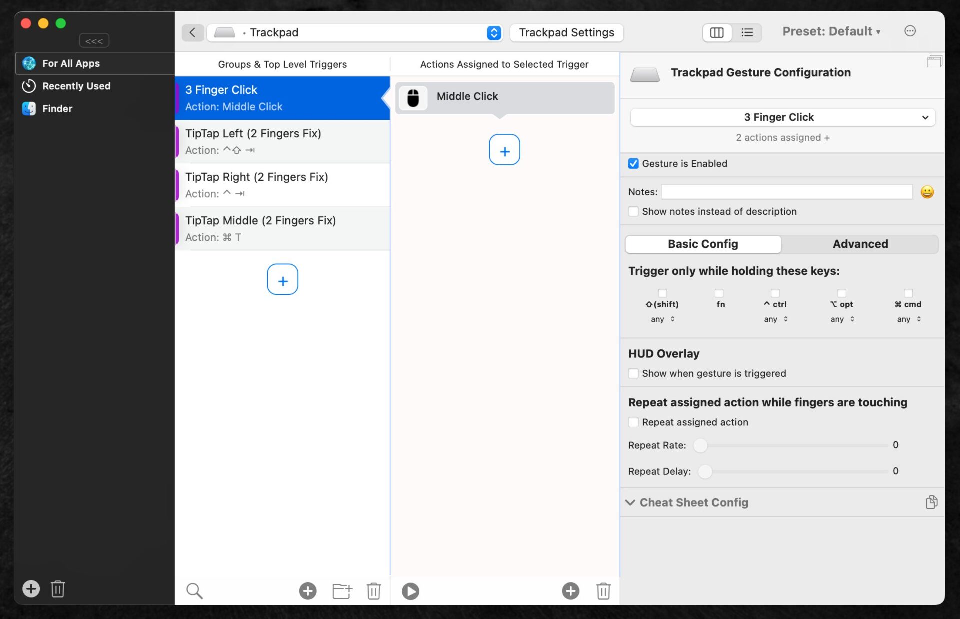 トリガー(ジェスチャーなど)とアクション(起動するコマンドなど)の組み合わせを自由に設定できるので、例えば3本指のスワイプでMission Controlを起動するなど、macOSで廃止されたジェスチャーを復活させることができる。