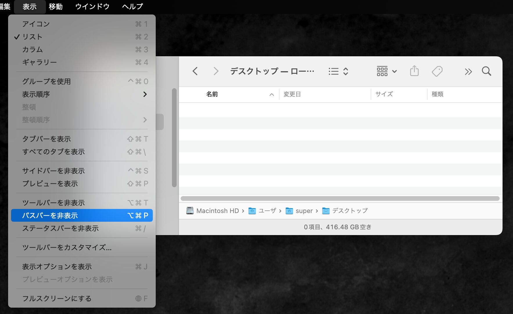 デフォルトでは表示されていないので、Finderのメニューの「表示」から、これらの表示領域をオンにしておくことをオススメする。