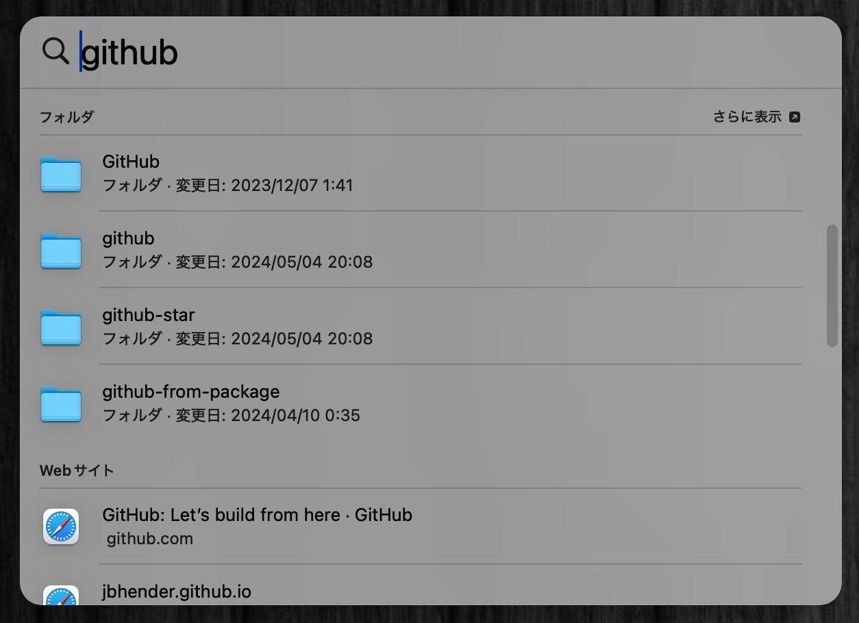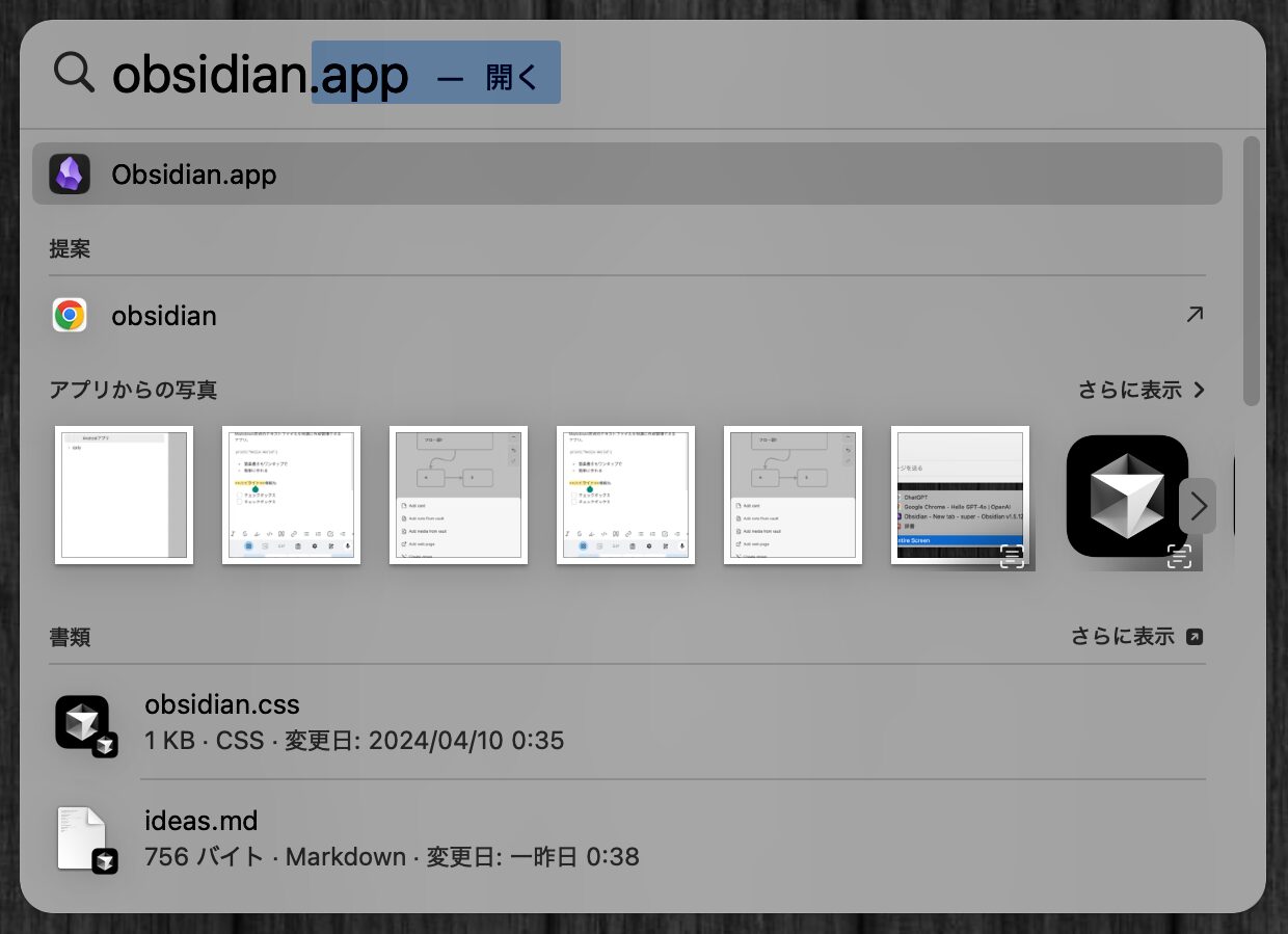 ファイルやフォルダを開くのも、名前を入力するだけで簡単に見つけられる。Finderを開いてファイルやフォルダを探す手間を大幅に削減できる。