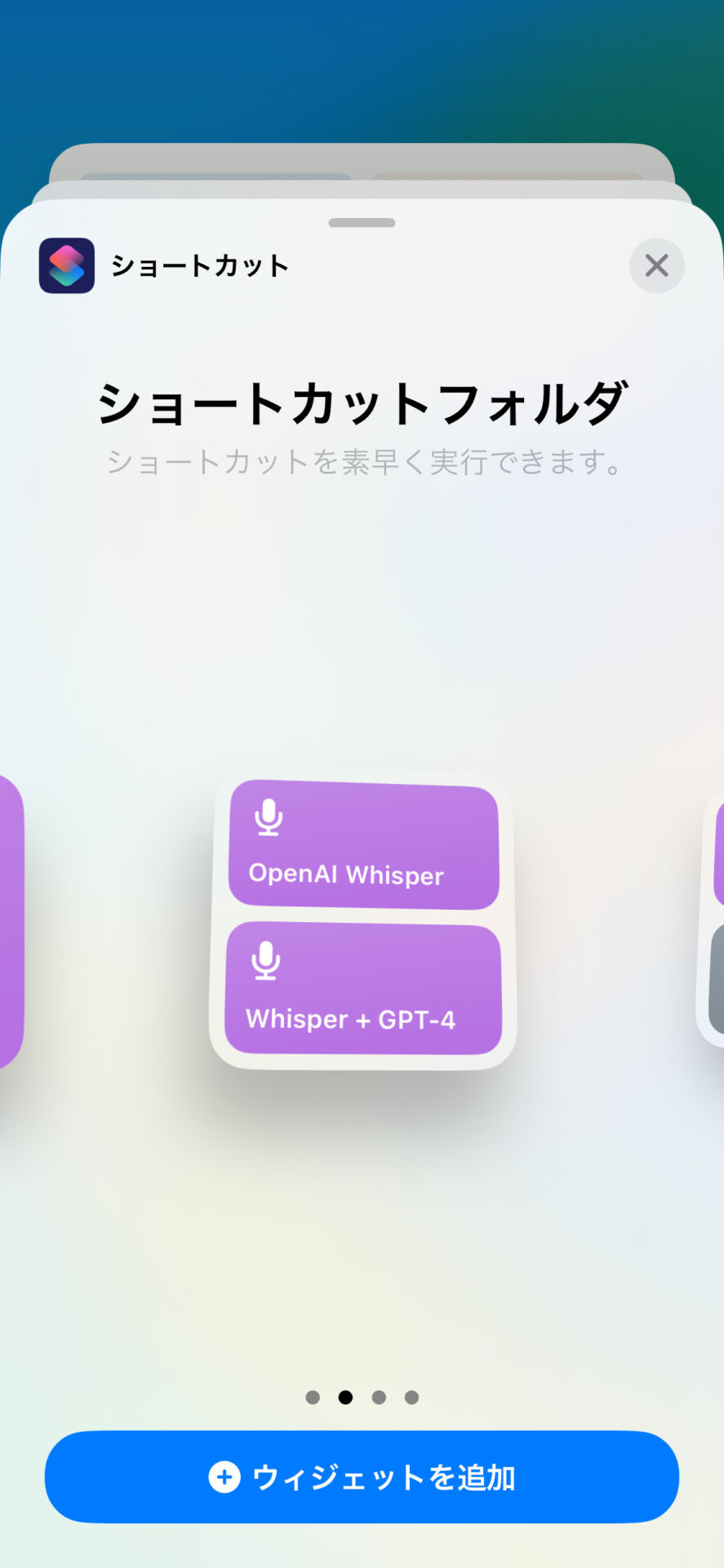 筆者は、後ほど紹介するGPT-4のAPIを合体させた強化バージョンと、GPT-4無しのWhisper単独バージョンの両方のショートカットを、ウィジェットに表示している。