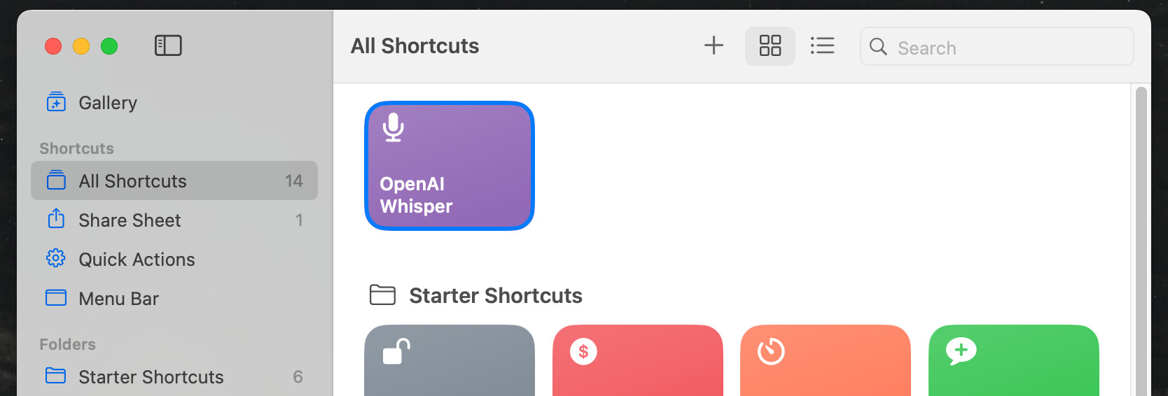 RoutineHubを開いて、「Get Shortcut」をクリックすると、ショートカットのファイルがダウンロードされる。これを開くと、Macのショートカットアプリに「OpenAI Whisper」というショートカットが追加される。