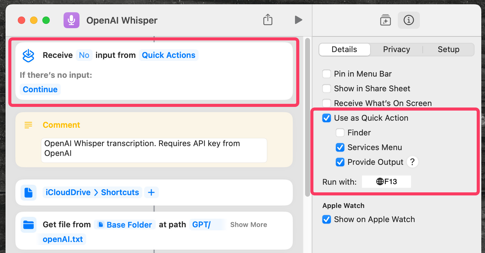 これによって、どの端末を使っているときでも、このショートカットでWhisper APIを呼び出せるようになるので、とても便利だ。