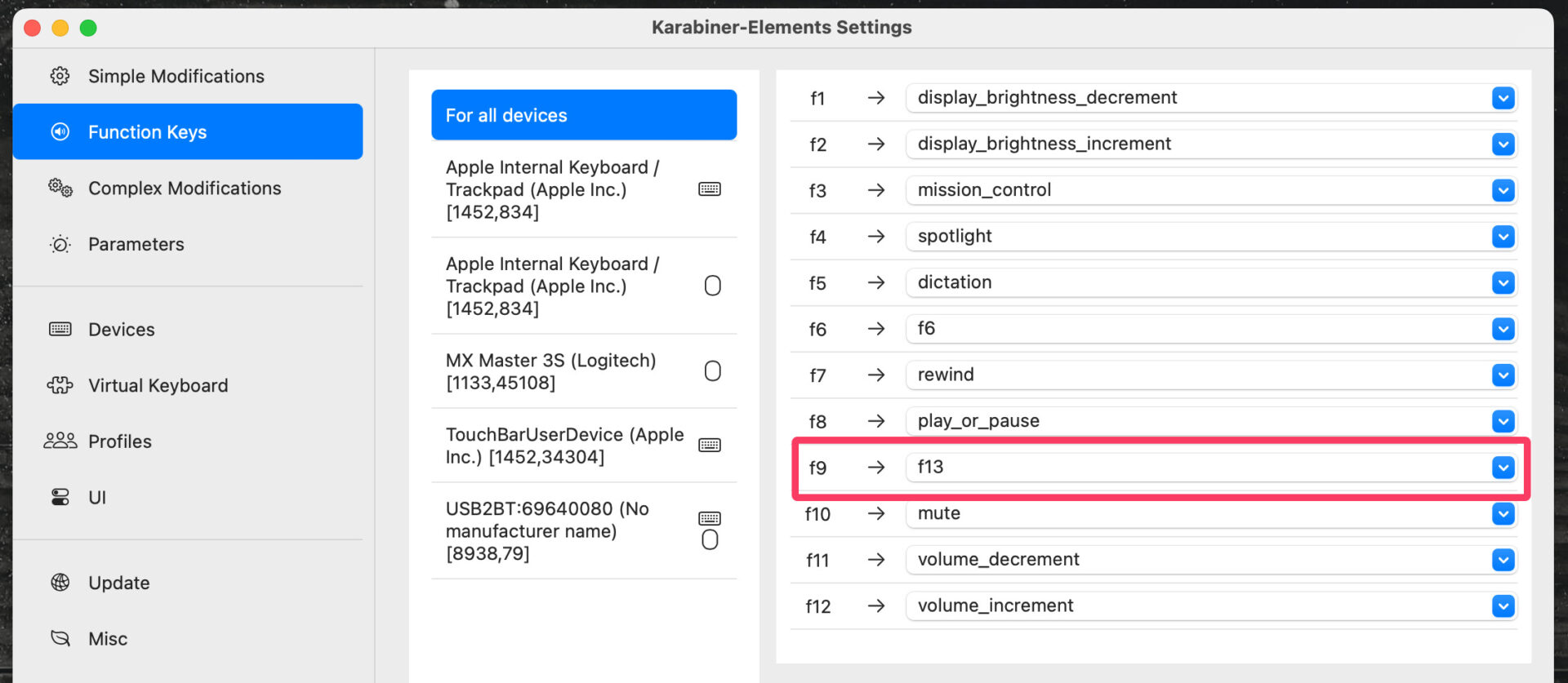 今回は、Karabinar-Elementsを使って、普段全く使っていないfunctionキー(私の場合F9)を、存在しないfunctionキー(F13)に変更し、それをWhisperを呼び出すホットキーとして利用する。