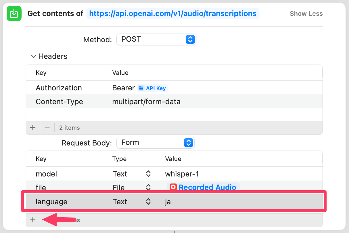 RoutineHubから入手してきた「OpenAI Whisper」のショートカットの編集画面を開き、APIリクエストの中身を編集して、日本語を指定するのがおすすめだ。