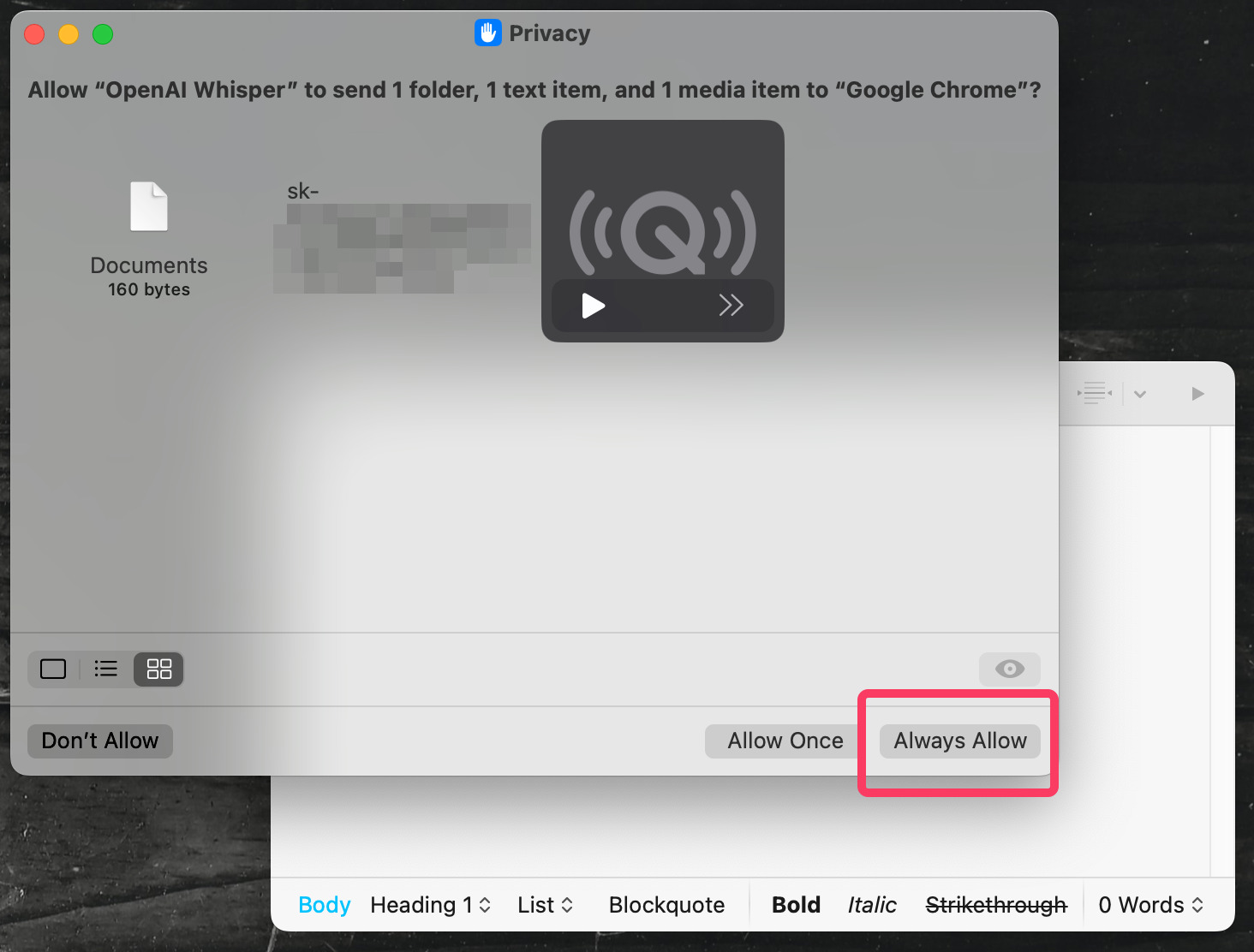 なお、初回のみ、この「OpenAI Whisper」のショートカットがGoogle Chromeなどにアクセス・ファイル送信して良いかを尋ねられるので、「常に許可」を選択すること。