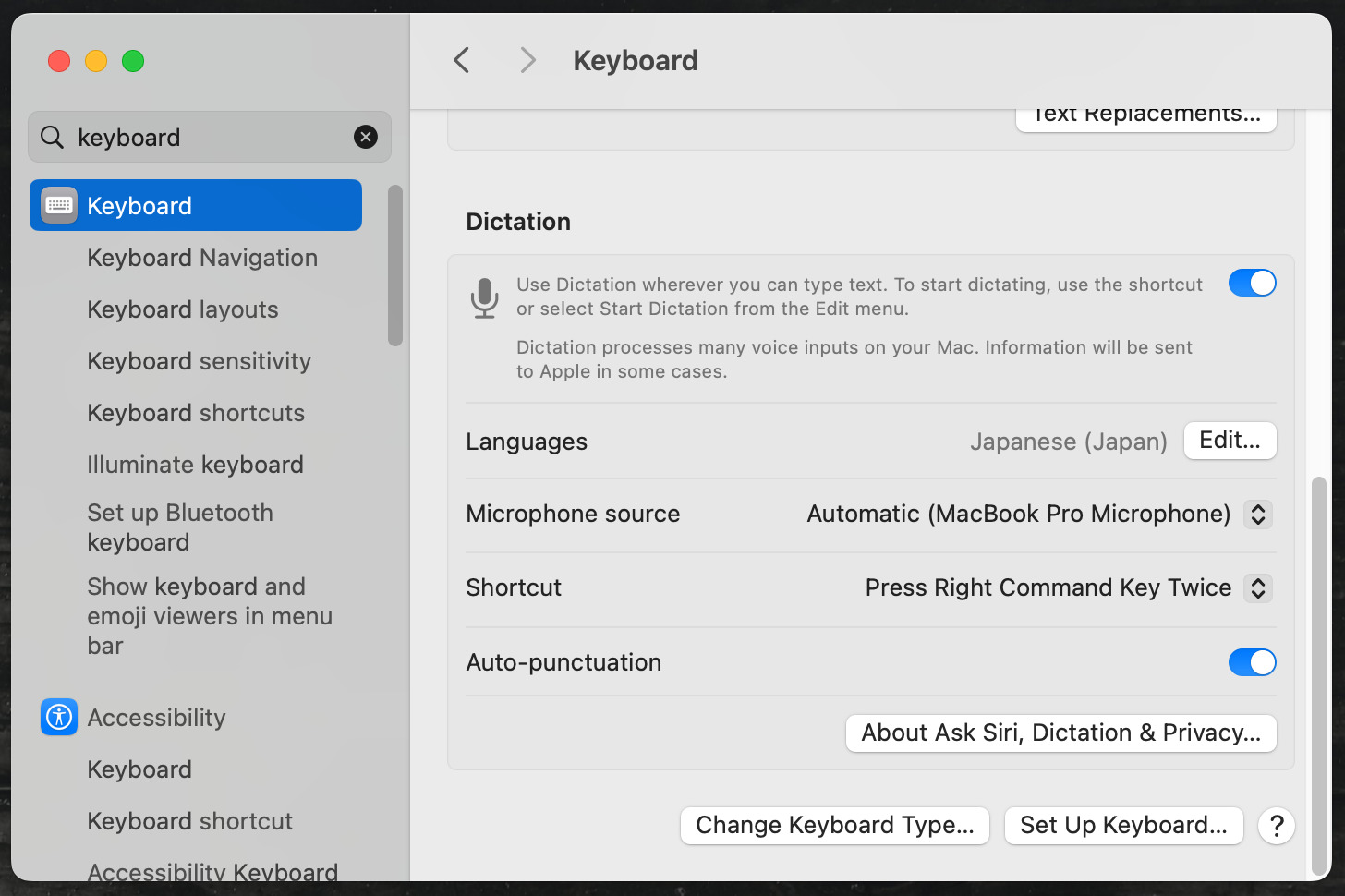 これをオンにしておくと、PagesやWord、ブラウザの検索バーなど、あらゆるアプリ上で、音声入力機能を利用できる。