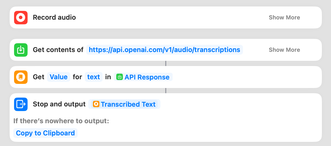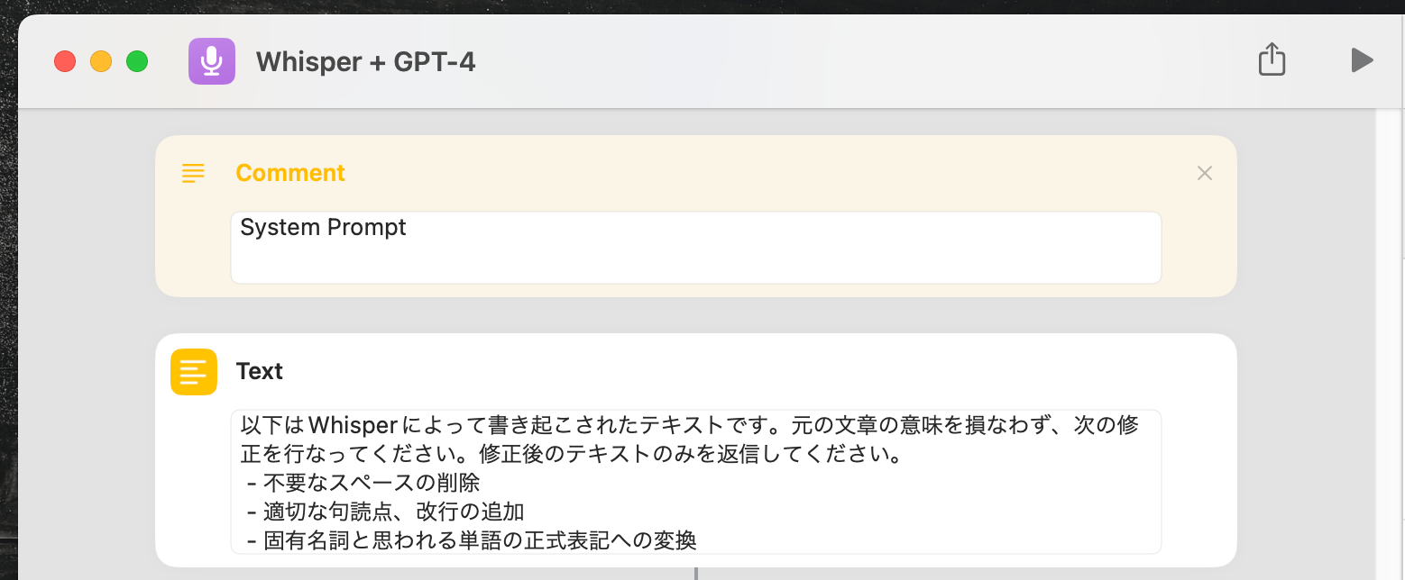 そこで、Whisperから出力された書き起こし後のテキストを、GPT-4のAPIに校正させることによって、さらに出力の精度を引き上げるという一連のプロセスを、ワンタップで実行できるショートカットを作ってみた。