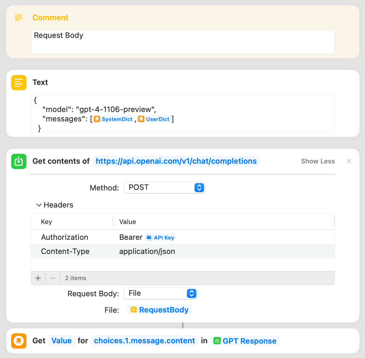 GPT-4を組み込むための改変を全て行った後のショートカットのダウンロードリンクも用意してあるが、どのような改変を行なったのかを一応解説していく。