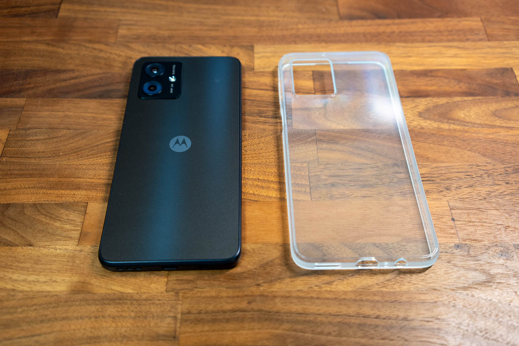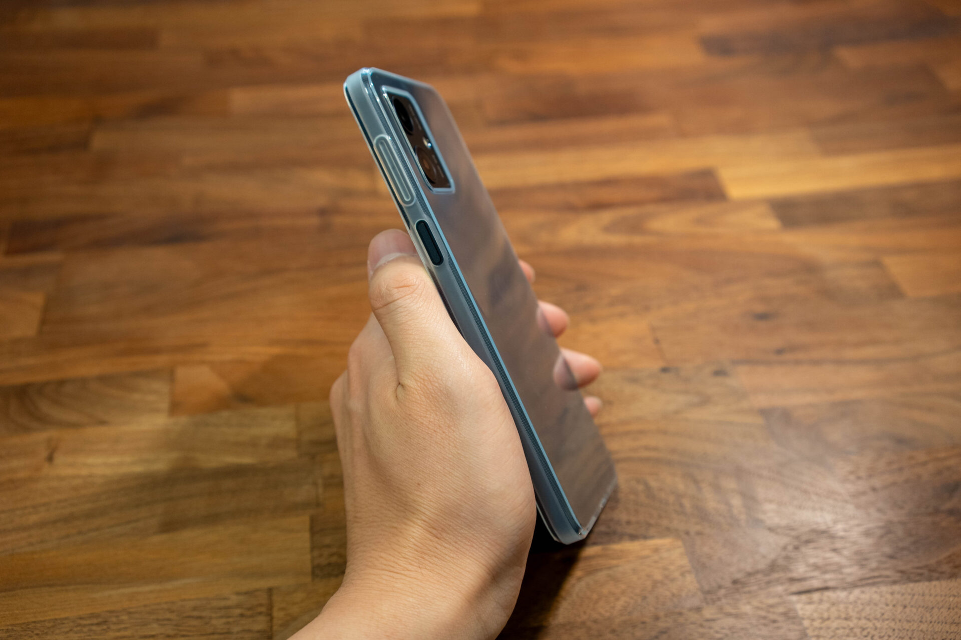 付属の透明ケースをつけると、カメラ部分の出っ張りもカバーされる。