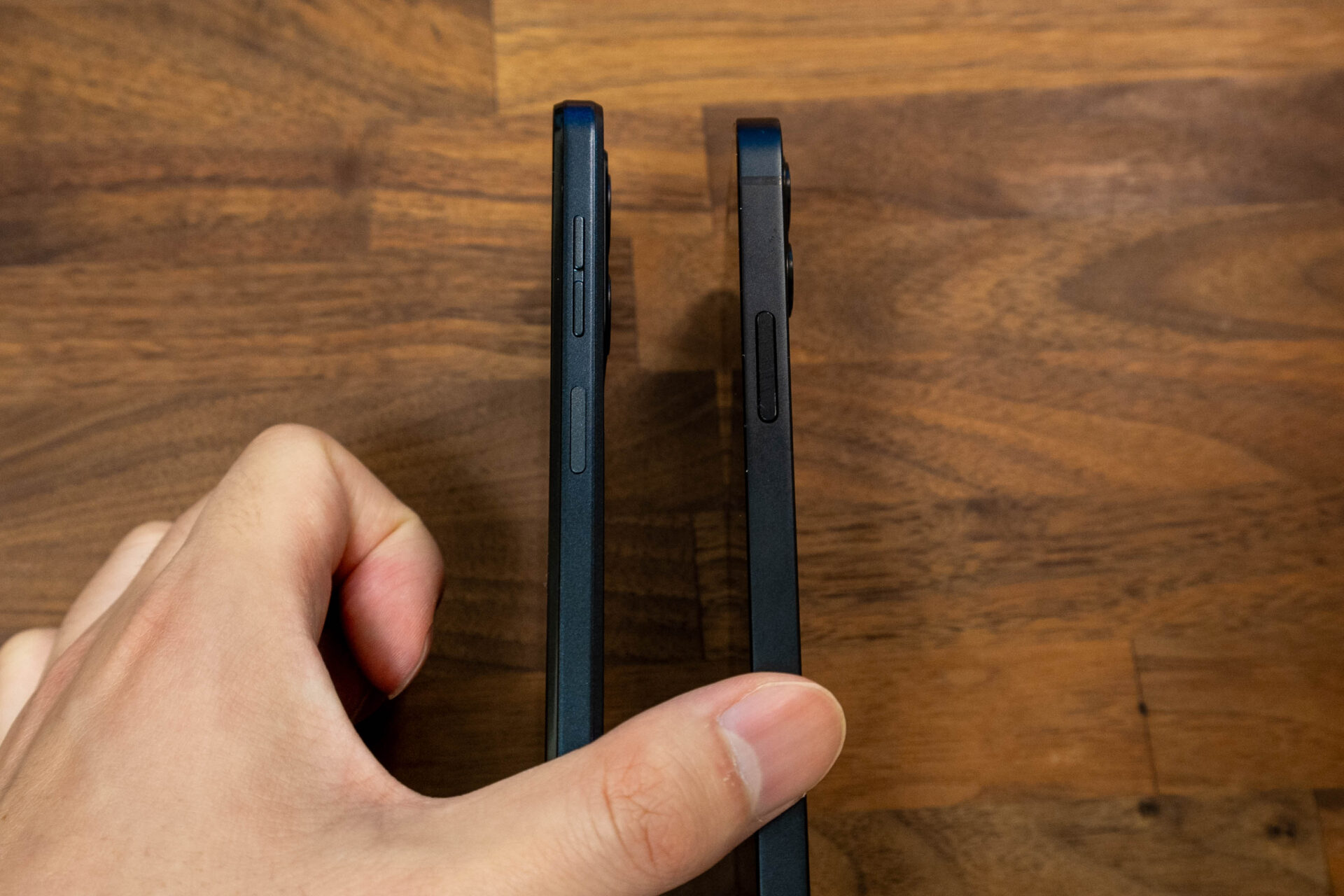 本体を横から見たのが以下の写真である。左がmoto g64、右がiPhone 12だ。