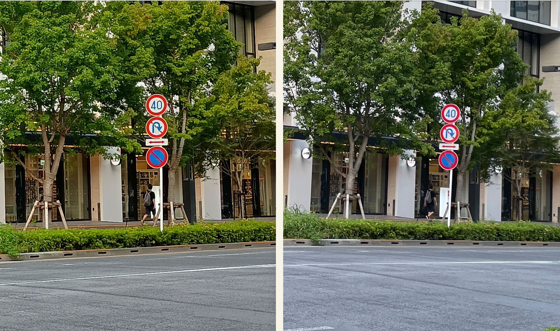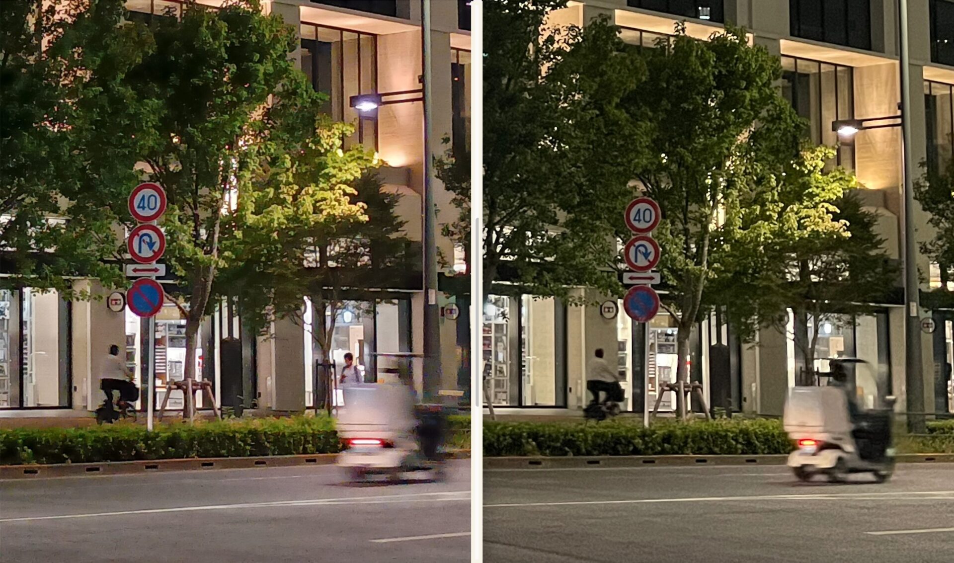 中央の交通標識とバイクのあたりを拡大して左右に並べてみたのが以下である。