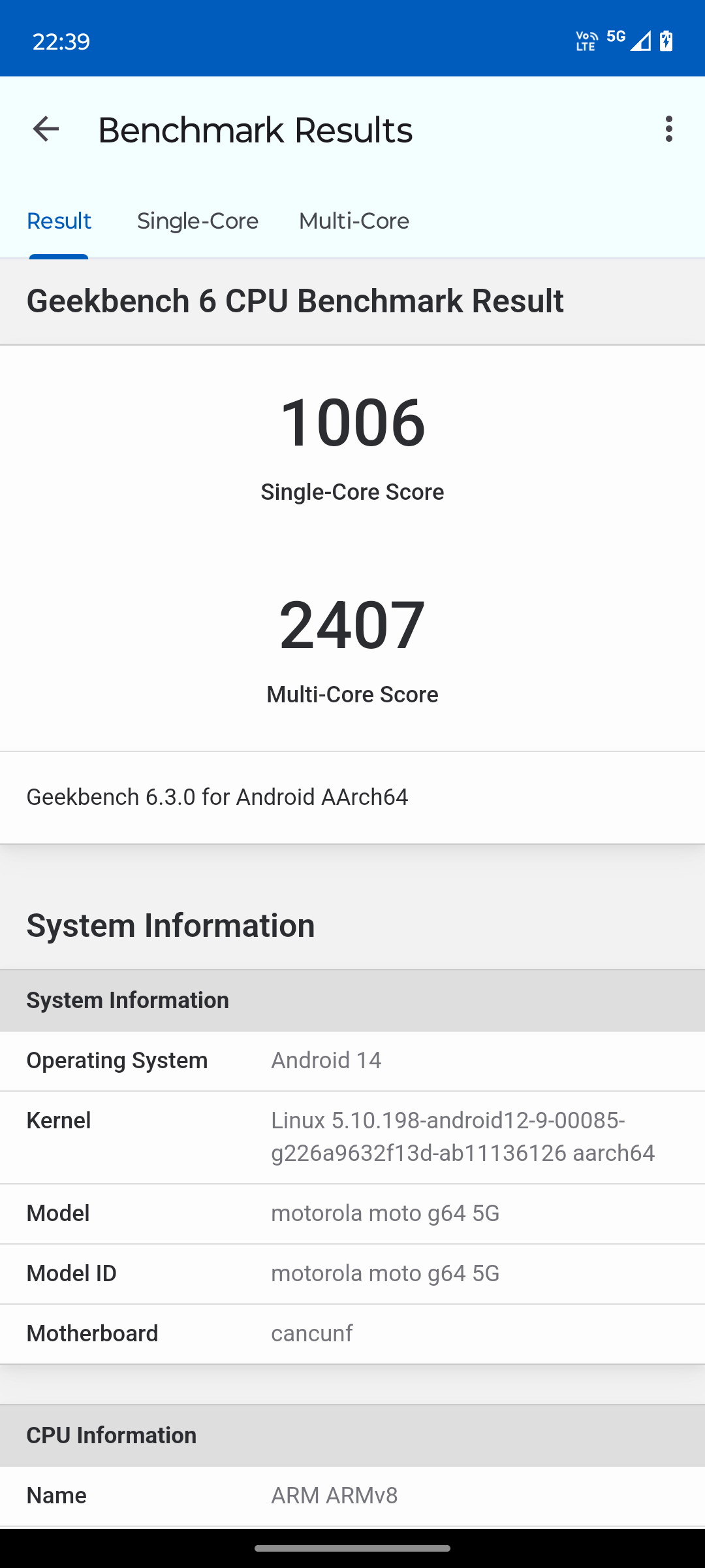 まずは、ベンチマークテストとして定番の「Geekbench 6」アプリを入れて、実際にmoto g64のCPU性能をテストしてみた。