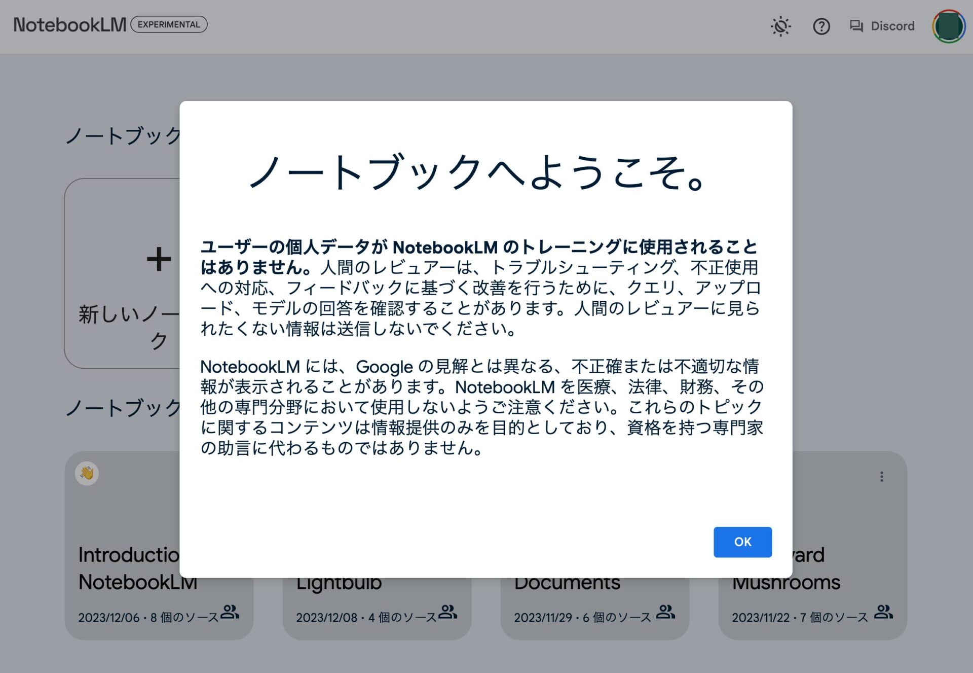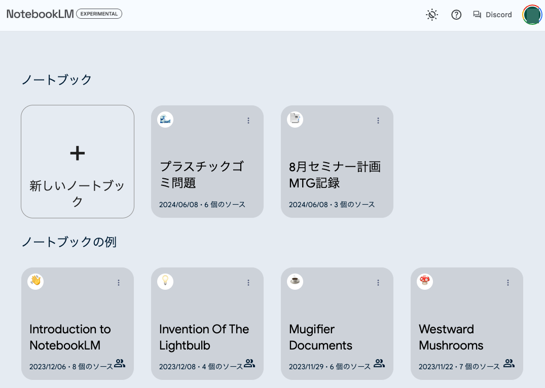 NotebookLMのホーム画面にある、「新しいノートブック」をクリックすると、新しいノートブックを作成することができる。