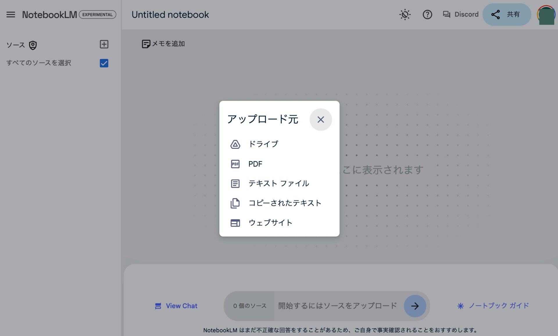 - AIの知識源となる「ソース」をアップロードする(PDF、Googleドキュメント・スライド、テキスト、Webページなど)