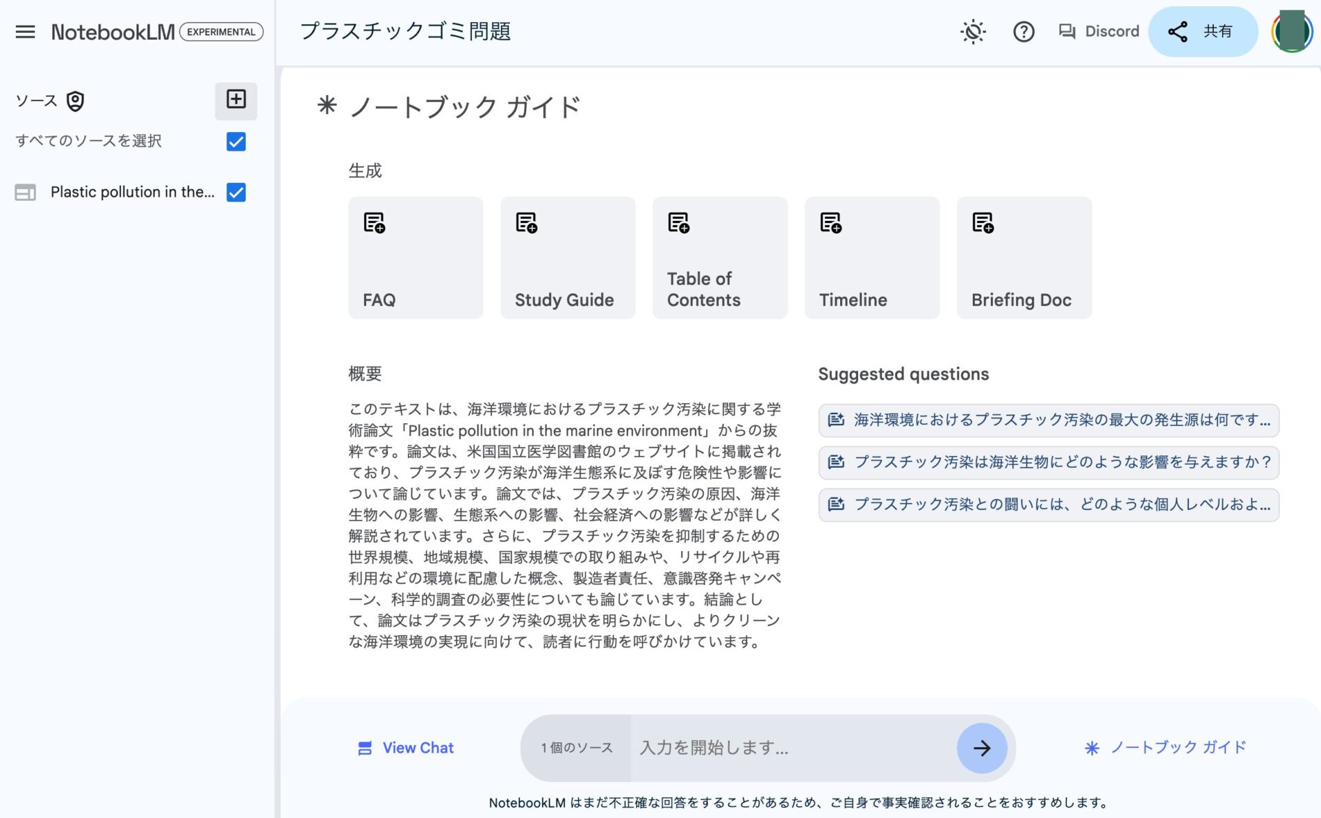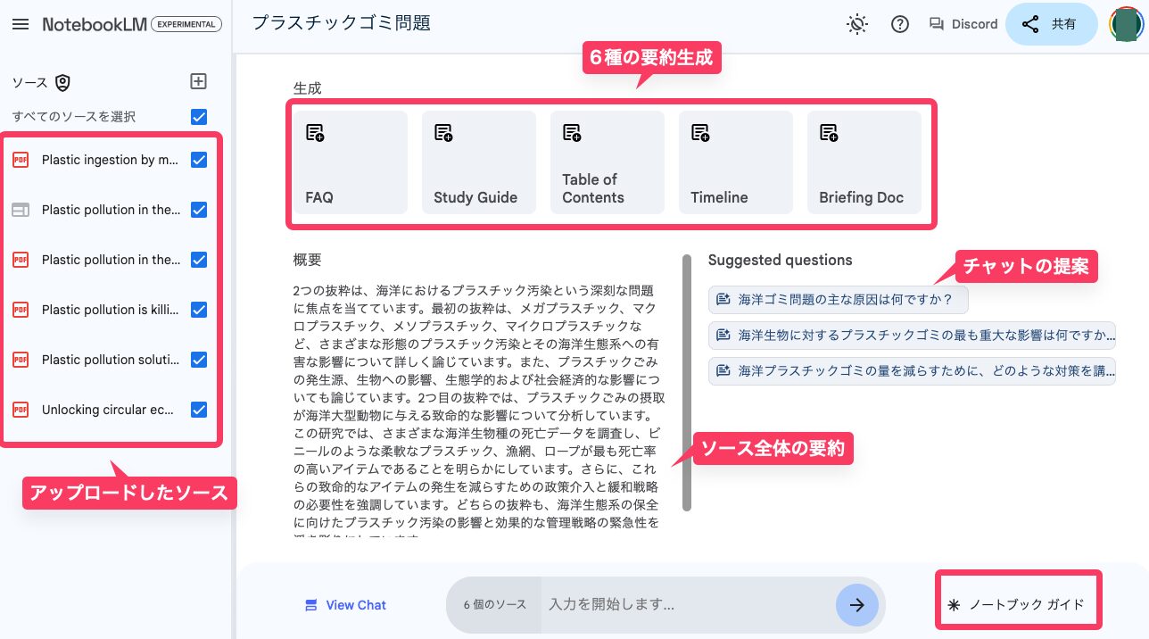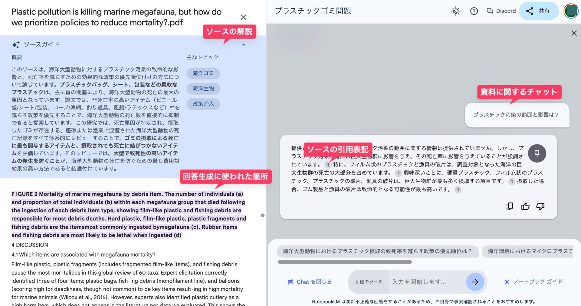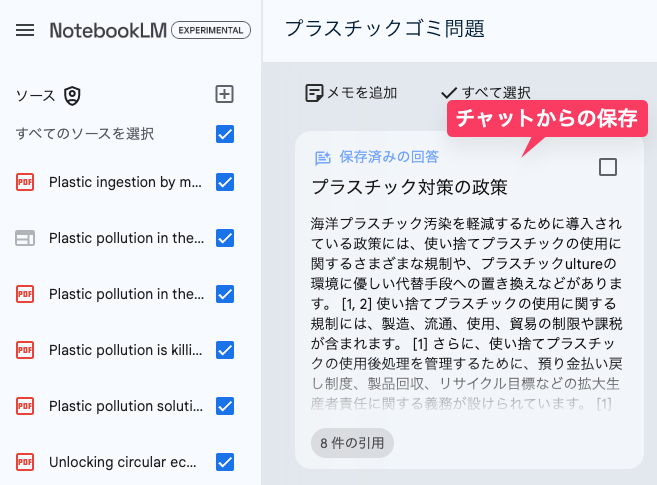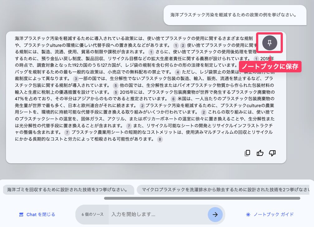 例えば、今回のプラスチック・海洋環境関する論文をアップロードしたノートブック上で、「プラスチック汚染の範囲と影響は?」という質問を投げかけてみると、AIがソースに基づいて回答を生成してくれる。