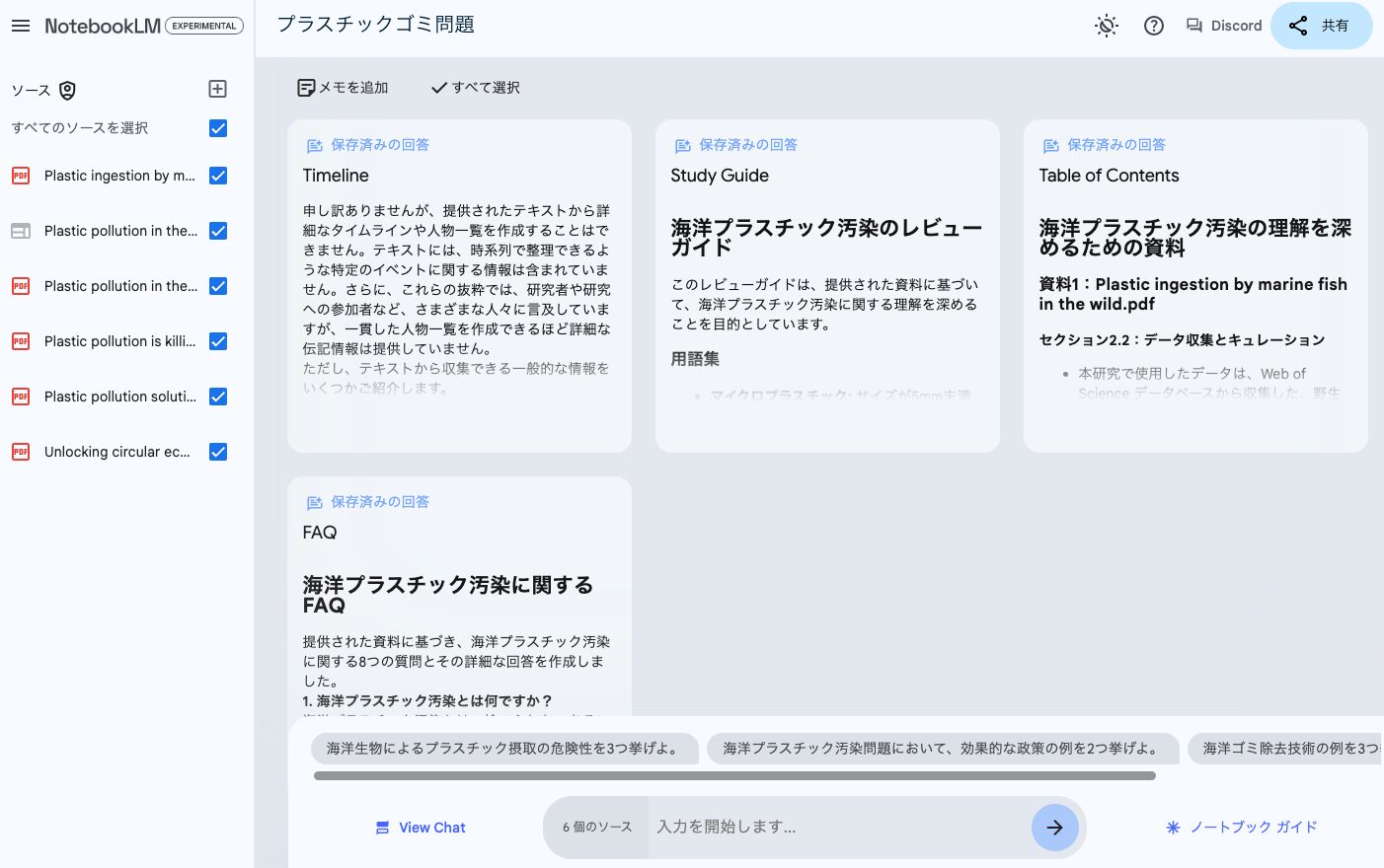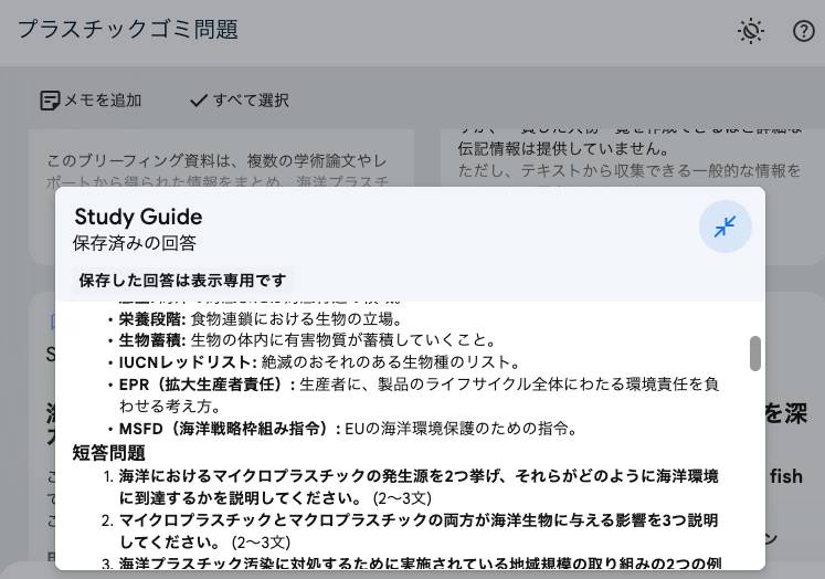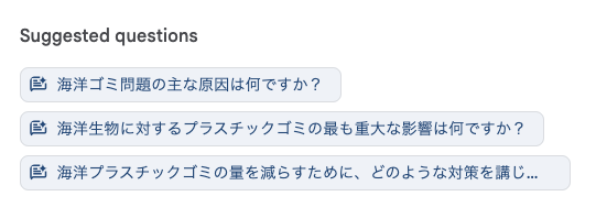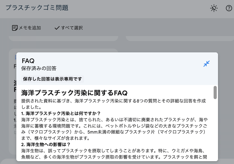 今回は、プラスチック汚染や、海洋環境に関する学術論文を複数アップロードしたので、「海洋プラスチック汚染とは何ですか?」「海洋生物への影響は?」など、それらの論文から導き出せる質問と答えがまとまっている。