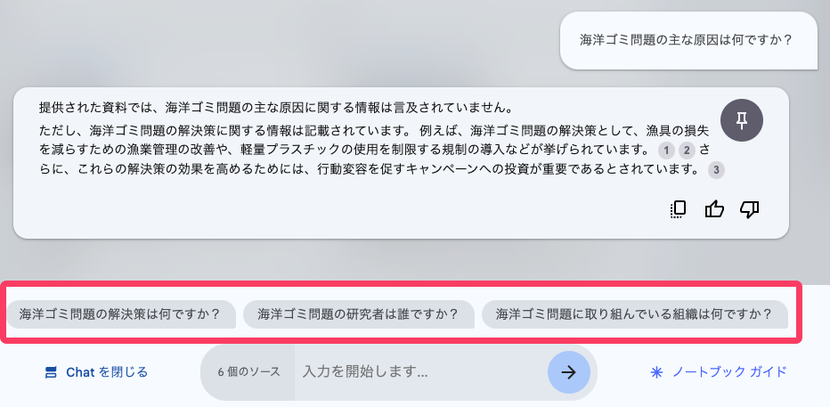 NotebookLMは、資料をアップロードした時点で、質問の候補が自動的に生成され、質問候補をクリックすることで即座にチャットを開始することができる。