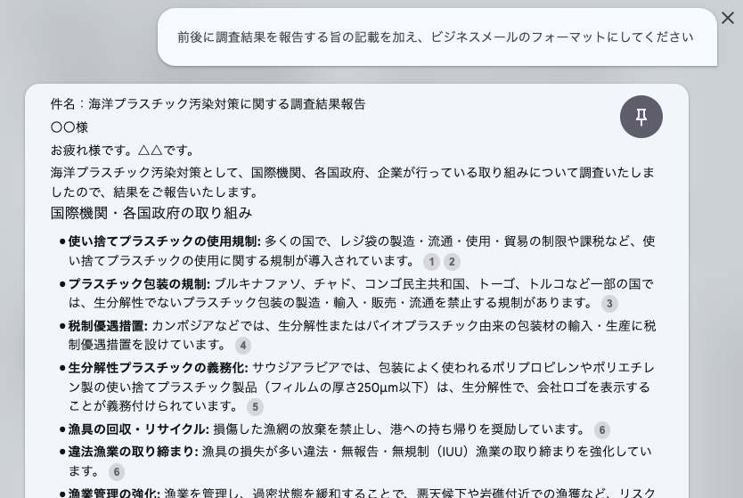 実際に、チャット内で、ビジネスメールの形式で、各国の政府によって行われているプラスチック汚染対策を箇条書きで整理させてみたのが以下だ。