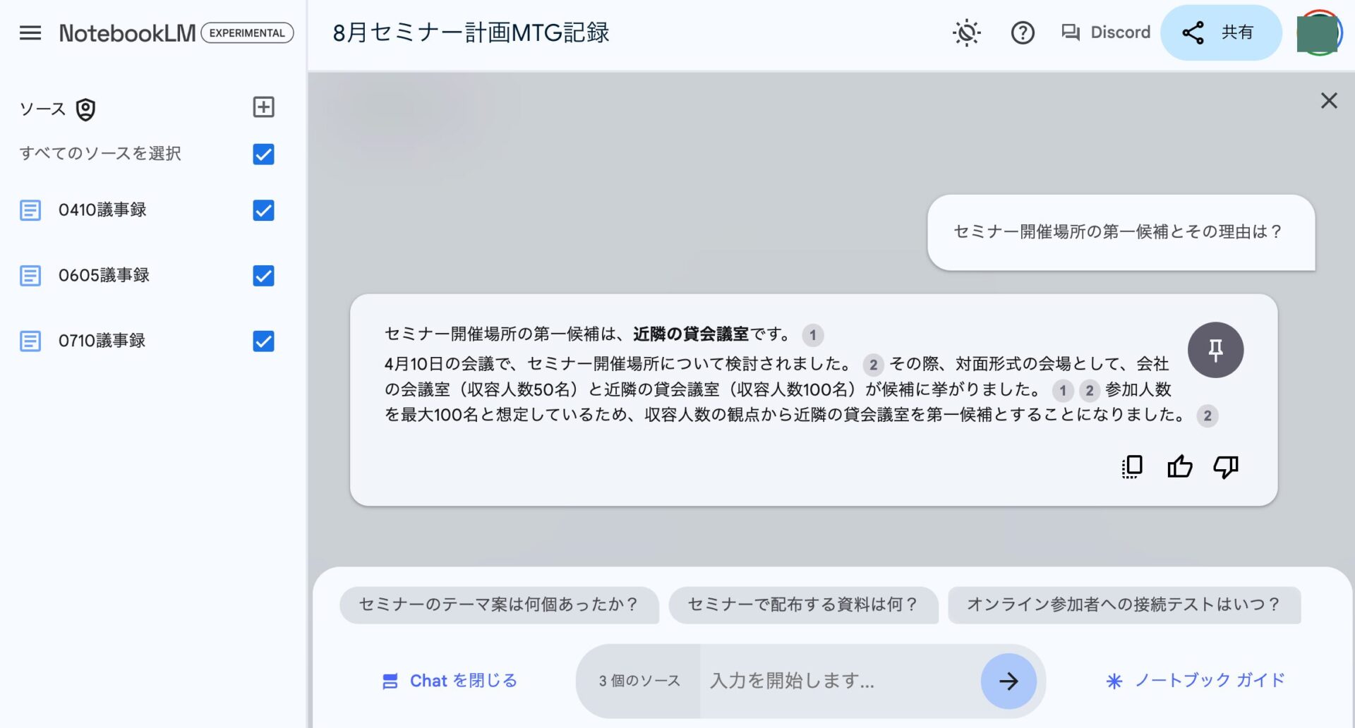 実際に、ある企業で計画が進められているセミナー開催プロジェクトの議事録サンプルを作り、それをNotebookLMに読み込ませてみた。