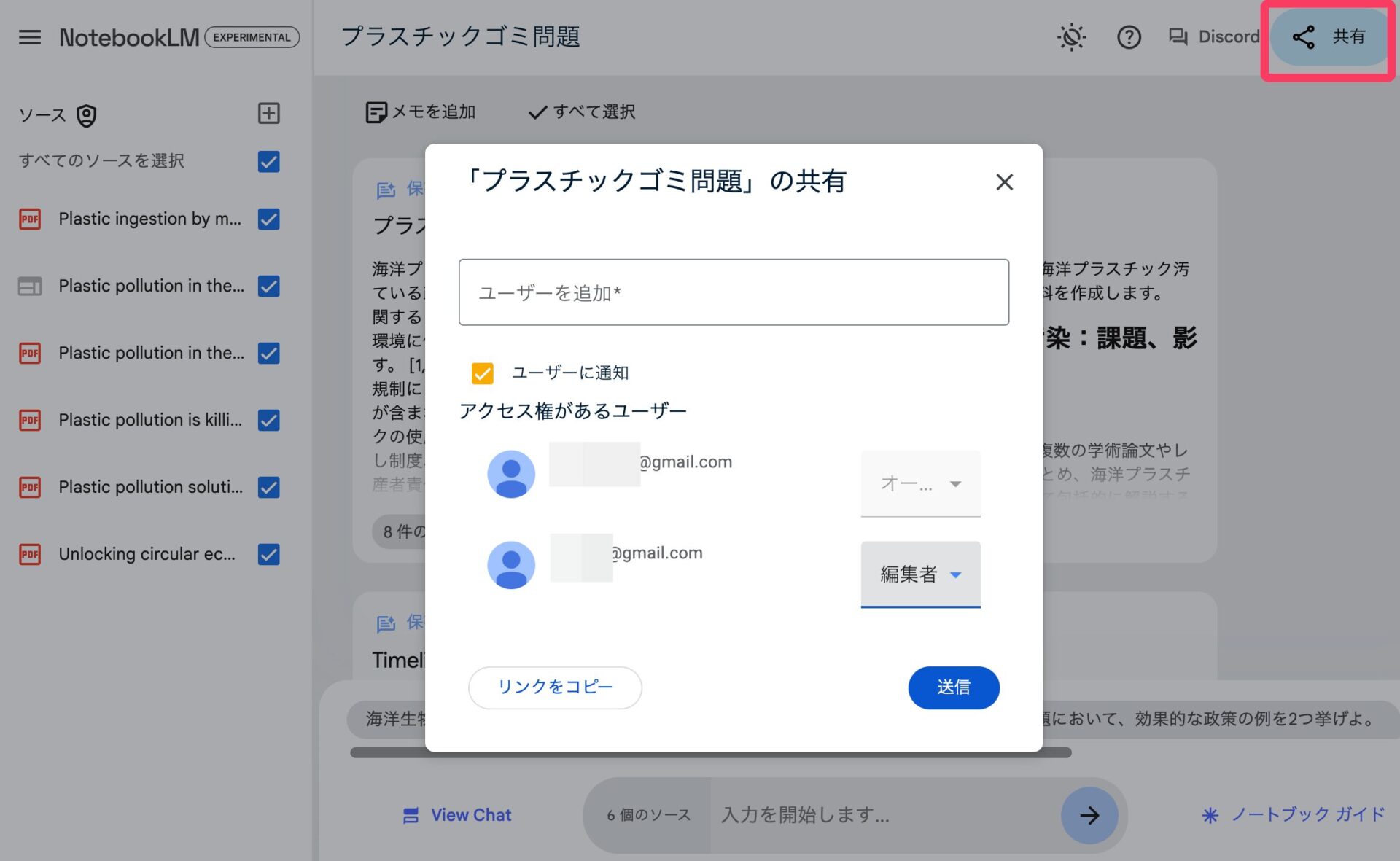 NotebookLMは、Googleドキュメント、スライド、スプレッドシートなどの他のGoogleのサービスと同じく、ファイルを他のユーザーと共有して、共同編集・共同閲覧することもできる。