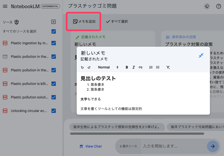 ノートブック内で、「メモを追加」ボタンをクリックすることで、ユーザーが自分でメモを書くことができるのだが、非常に基本的な見出し・太字・箇条書きくらいのフォーマットができるだけで、EvernoteやNotionなどのような拡張性はない。