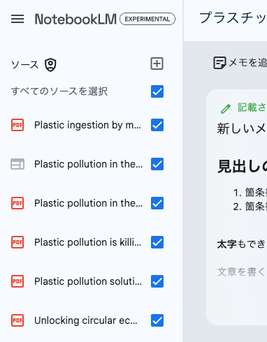 今回はサンプルとして、学生がレポートを作成するようなシーンを想定し、プラスチックと海洋環境に関する学術論文を複数用意して、それをAIの力を借りて整理していく作業を行っていく。