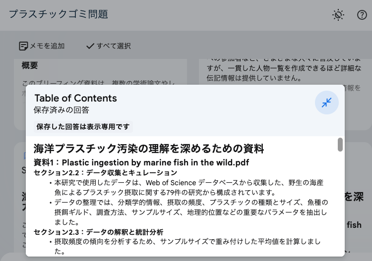 今回のサンプルでは、プラスチックの海洋環境への影響や、生物への影響、各国の政策など、バラバラのトピックの学術論文を多数読み込ませているが、それらを的確に整理して、一つのレポート資料としてまとめてくれた。