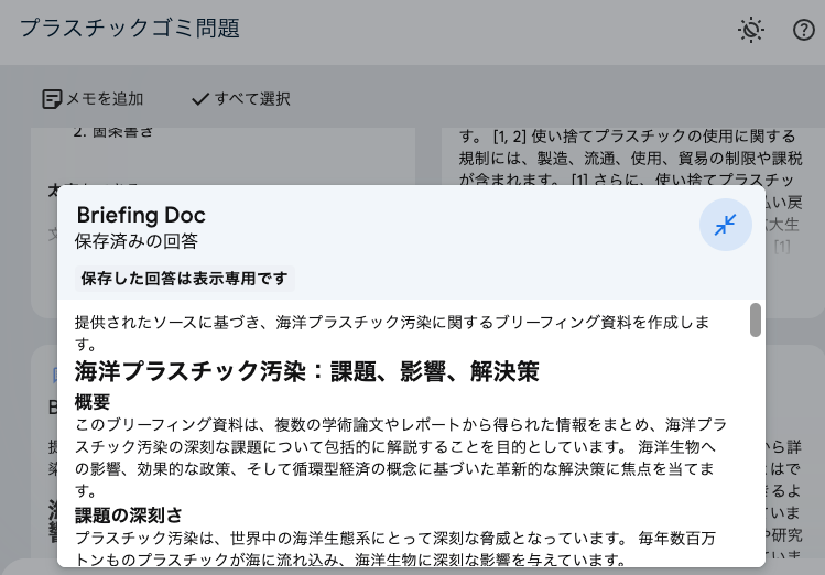 - Briefing Doc(ソース全体をまとめたブリーフィング資料を生成)