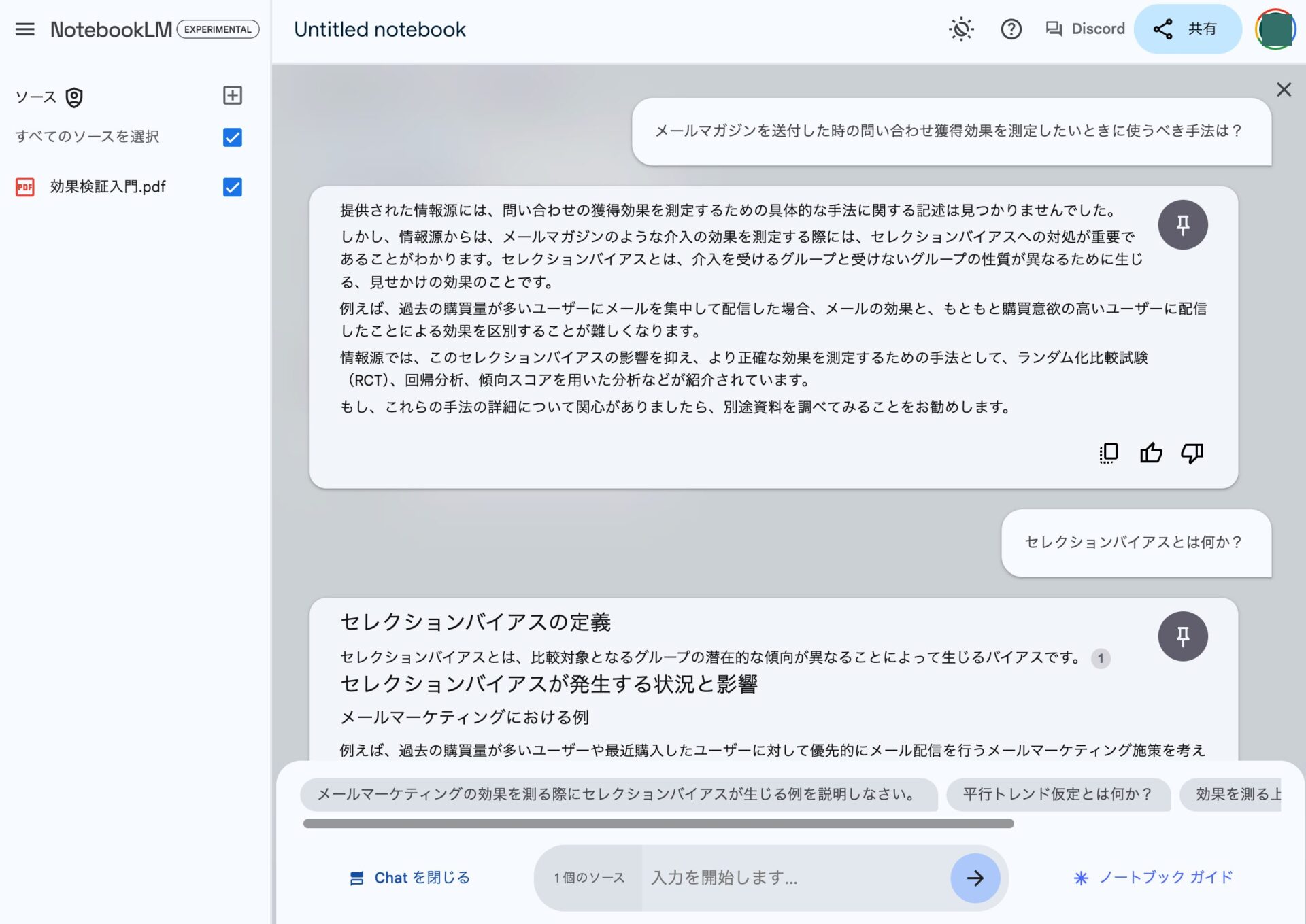 そこで、「メールマガジンを送付した時の問い合わせ獲得効果を測定したいときに使うべき手法は?」と自分が関心を持っているデータ分析の方法をNotebookLMに質問してみると、セレクションバイアスに注意が必要であること、正確な効果を測定するためにRCT、回帰分析、傾向スコアなどの手法があるという回答が得られた。