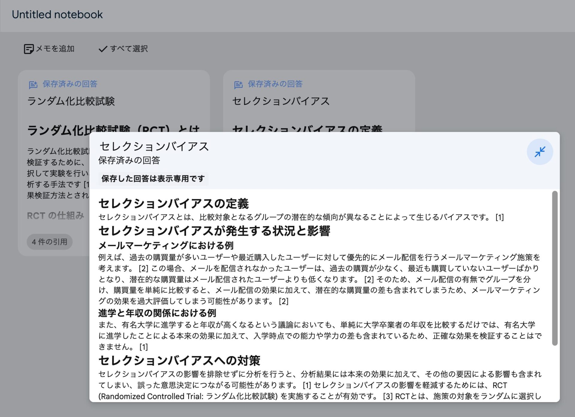 AIが整理してくれたノートは、そのままピン留めして保存しておけば、「セレクションバイアス」「ランダム化比較試験」など、書籍の中で自分が学習すべき概念がまとまったノートがどんどん生成されていく。