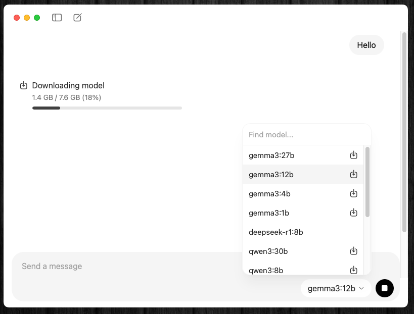 新アプリでは、チャットボックス右下でチャットしたいモデルを選択し会話を始めると、自動的にモデルのダウンロードが開始される。