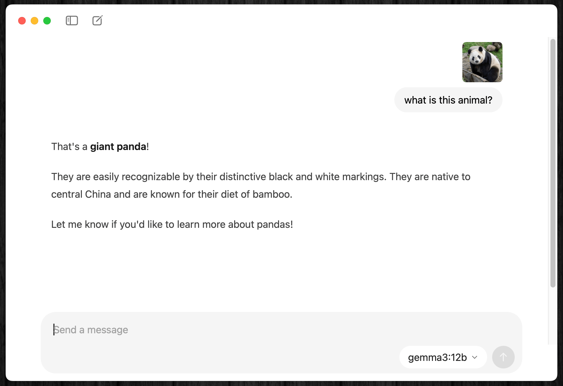 適当に見つけてきたフリー素材のパンダの画像をドラッグ&ドロップして、画像の内容をマルチモーダル・ビジョンに対応したGemma 3に聞いてみる。