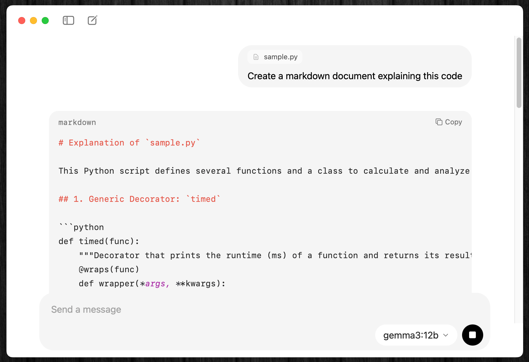例えば、適当なPythonファイルを用意して、その意味をMarkdown形式の文章で解説させてみる。