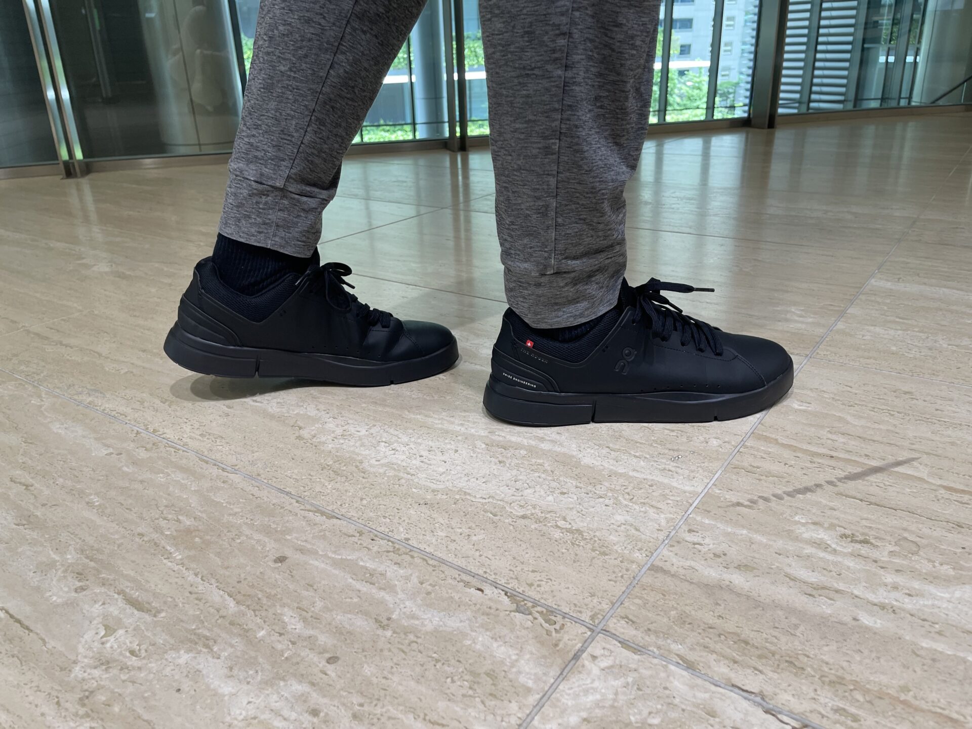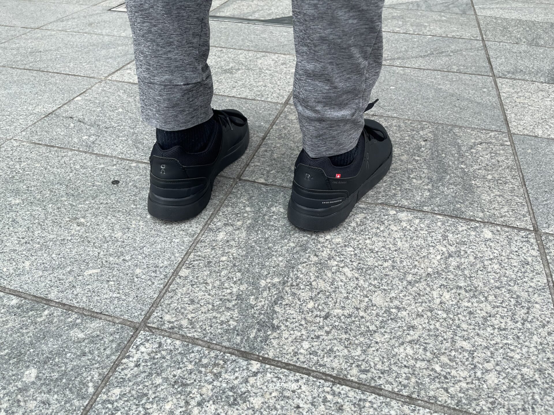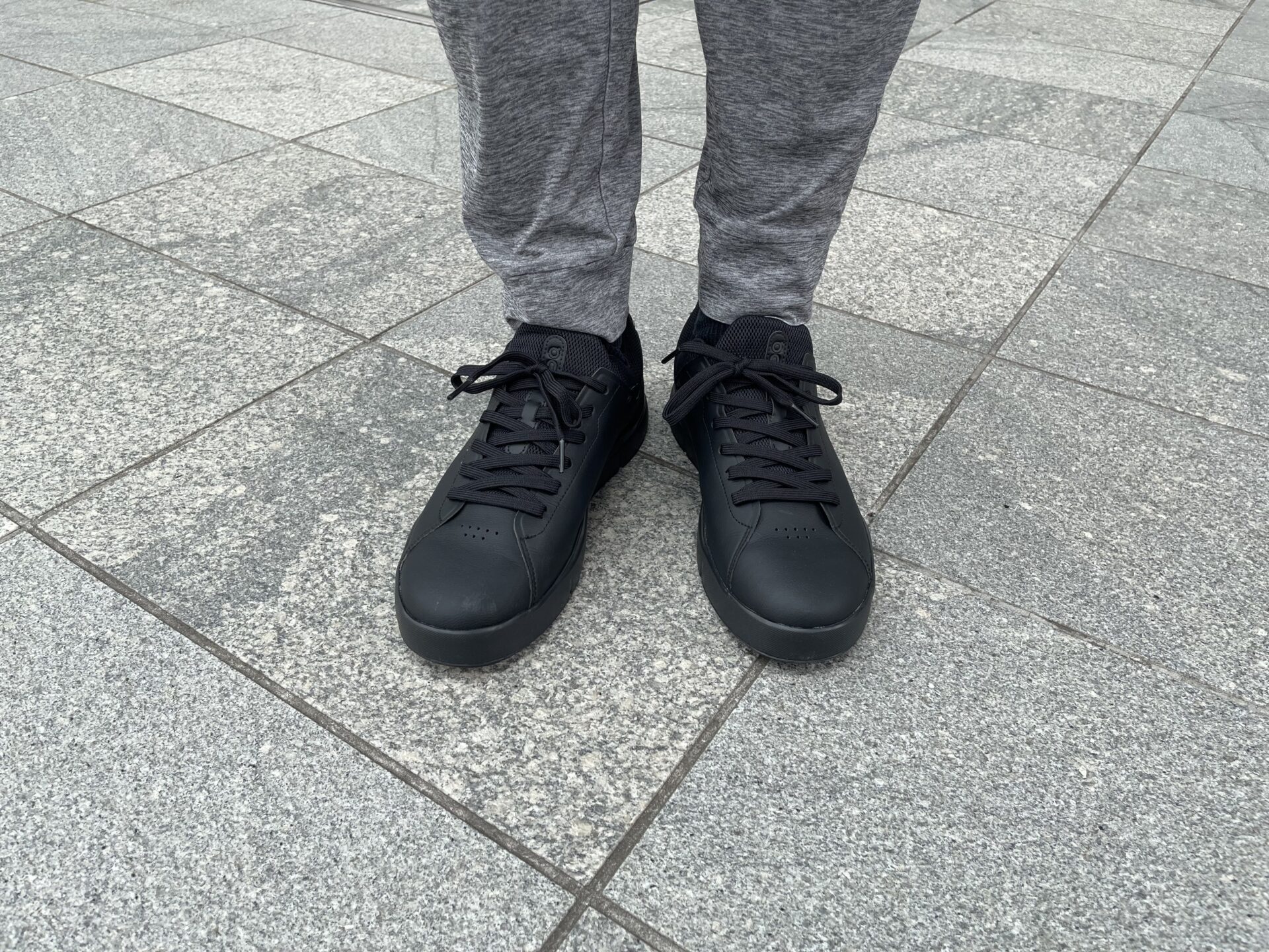 THE ROGER Advantageの場合、割と控えめかつ本体と同じ黒色で「On」のロゴが刻まれており、ニューバランスよりは「スニーカー感」が目立ちにくいように思う。