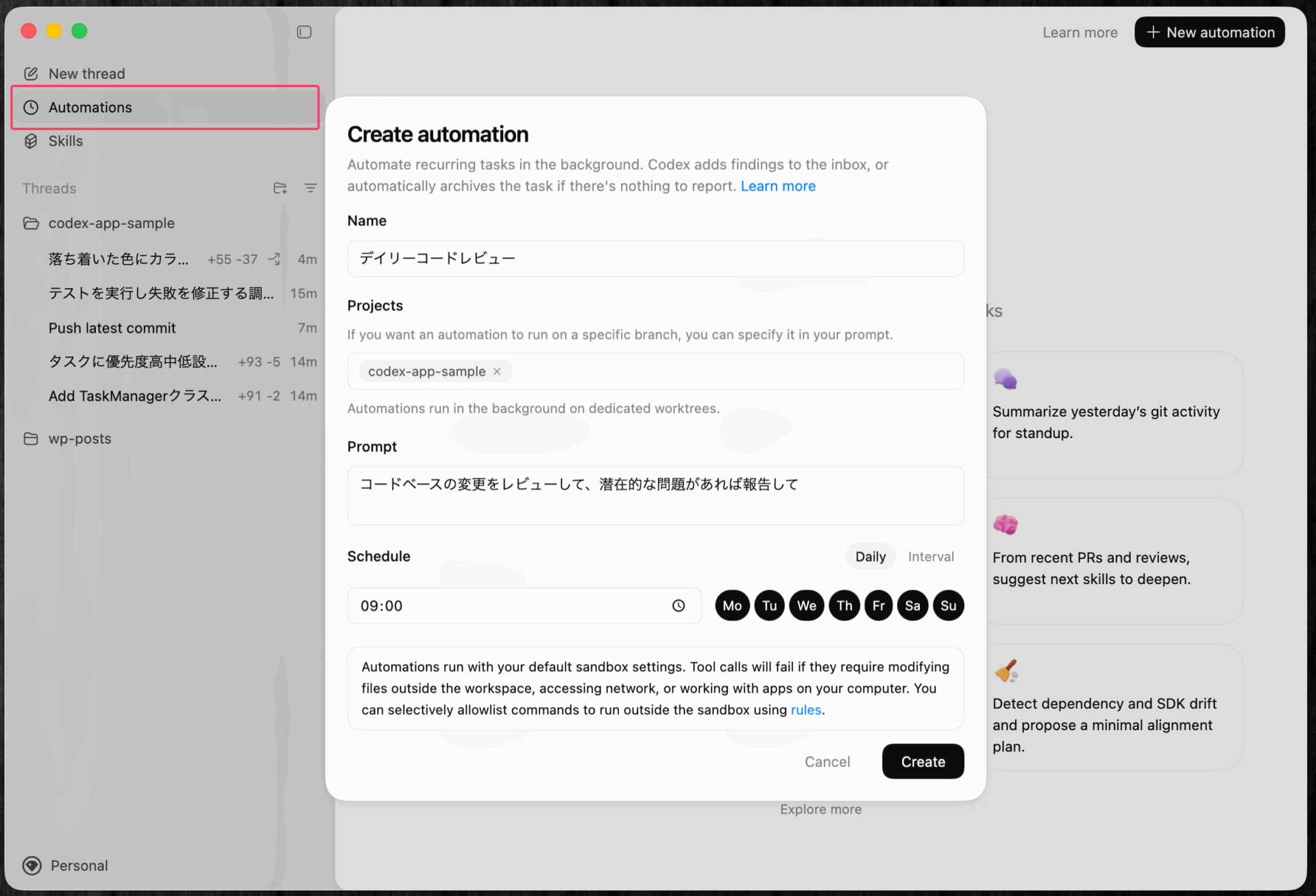 - 定期的な自動実行タスクを設定できる仕組み(Automations)