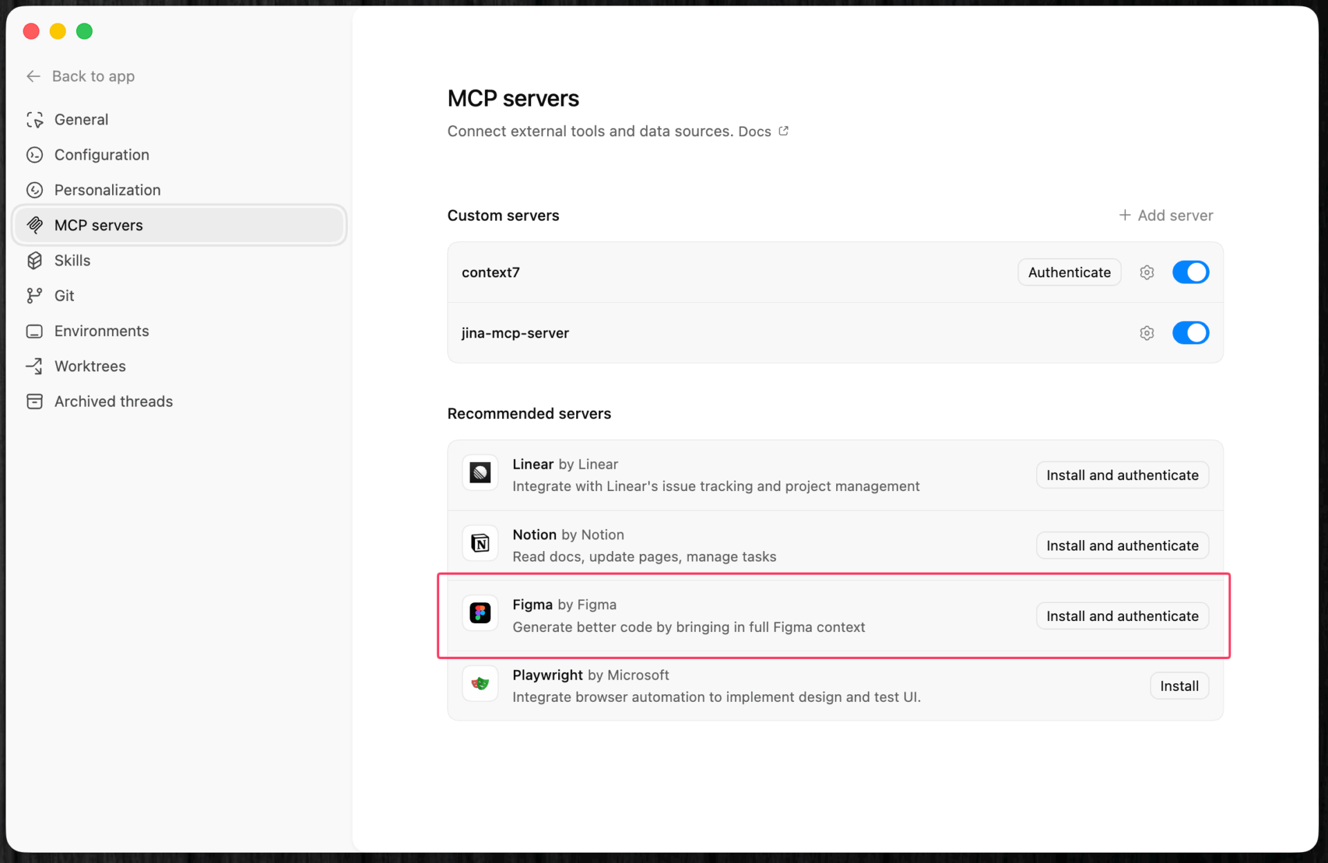 Codexの Settings > MCP servers から、MCPサーバーとの接続も可能なので、ここでFigmaのMCPを有効にしておこう。