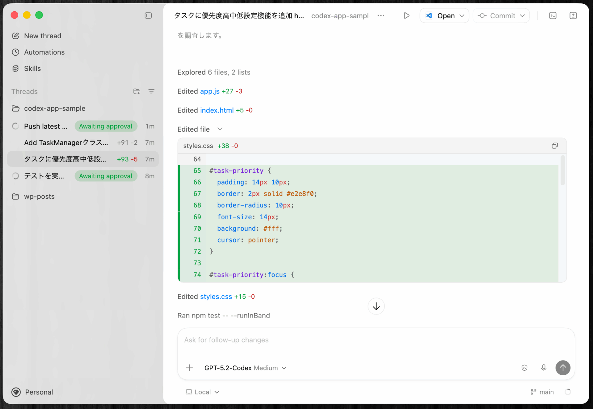 - Diffの確認: エージェントが加えた変更をdiffペインで確認できる。インラインコメントを追加してCodexに修正を依頼することも可能