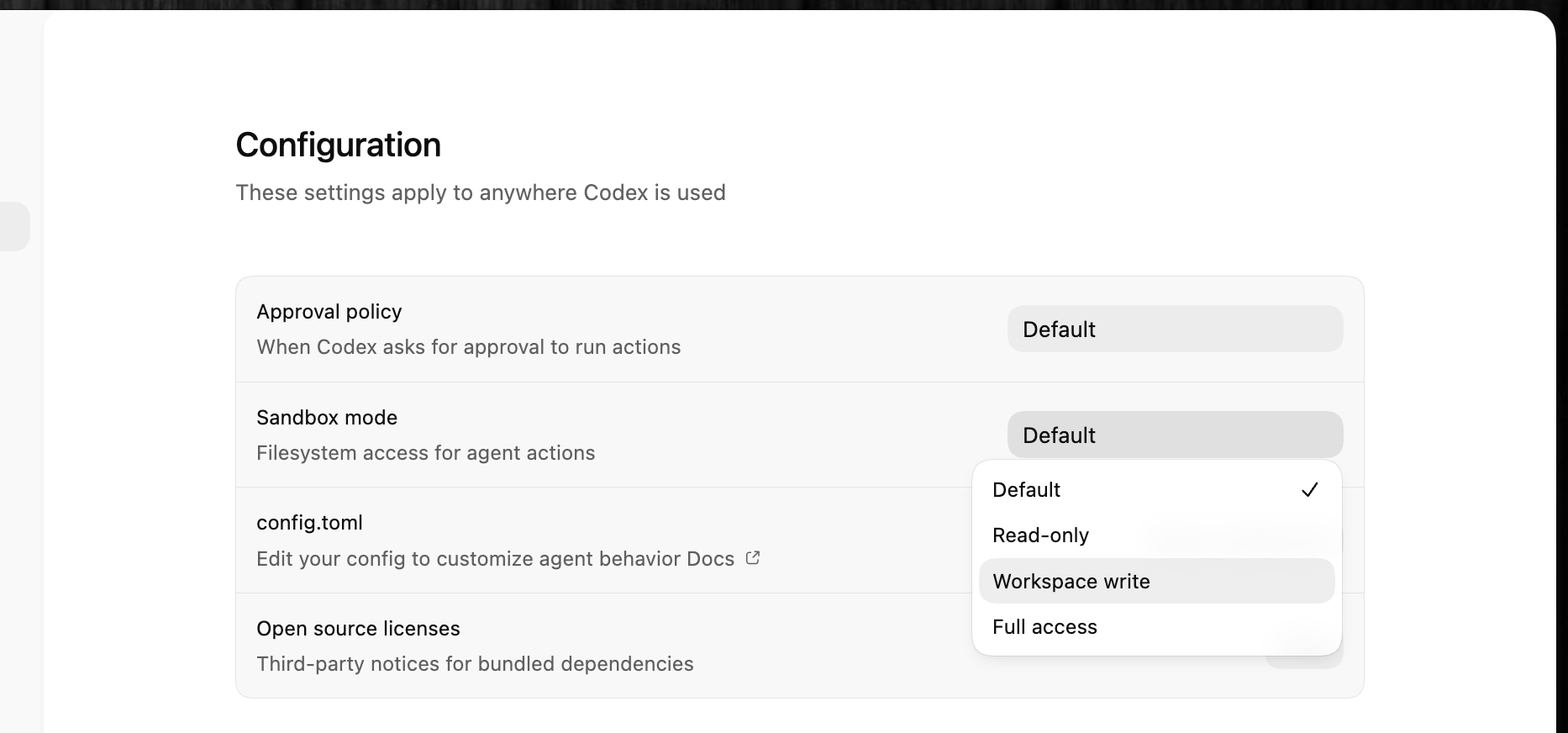 | Workspace Write | ワークスペース内のファイル読み書きとコマンド実行が可能。ネットワークアクセスは無効 |