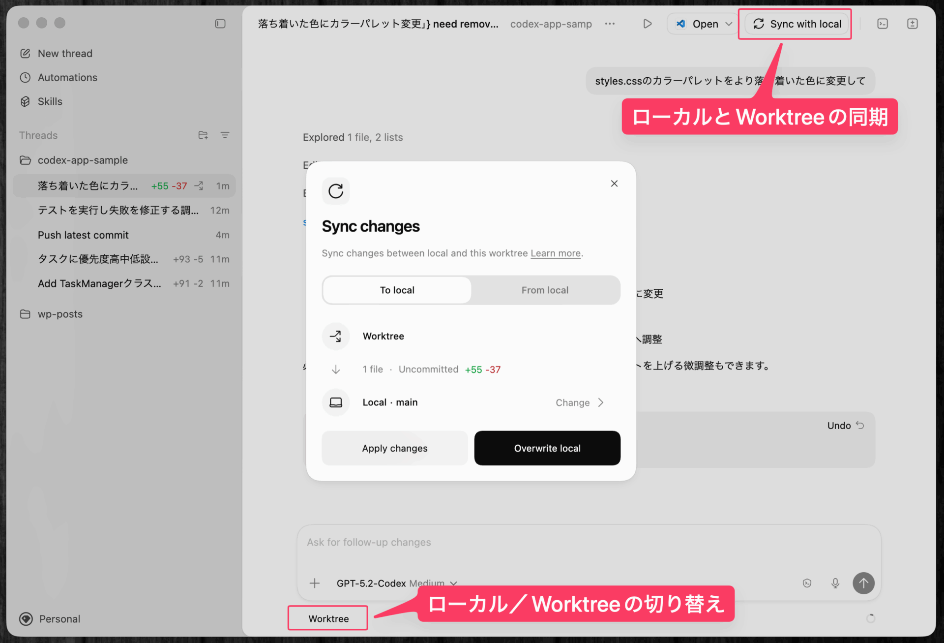 IDE拡張機能との同期: Codex IDE拡張機能がインストールされている場合、同じプロジェクトを開いているとアプリとIDEが自動的に同期する。IDEで開いているファイルのコンテキストをアプリで参照したり、アプリで実行中のスレッドをIDE側で確認したりできる。