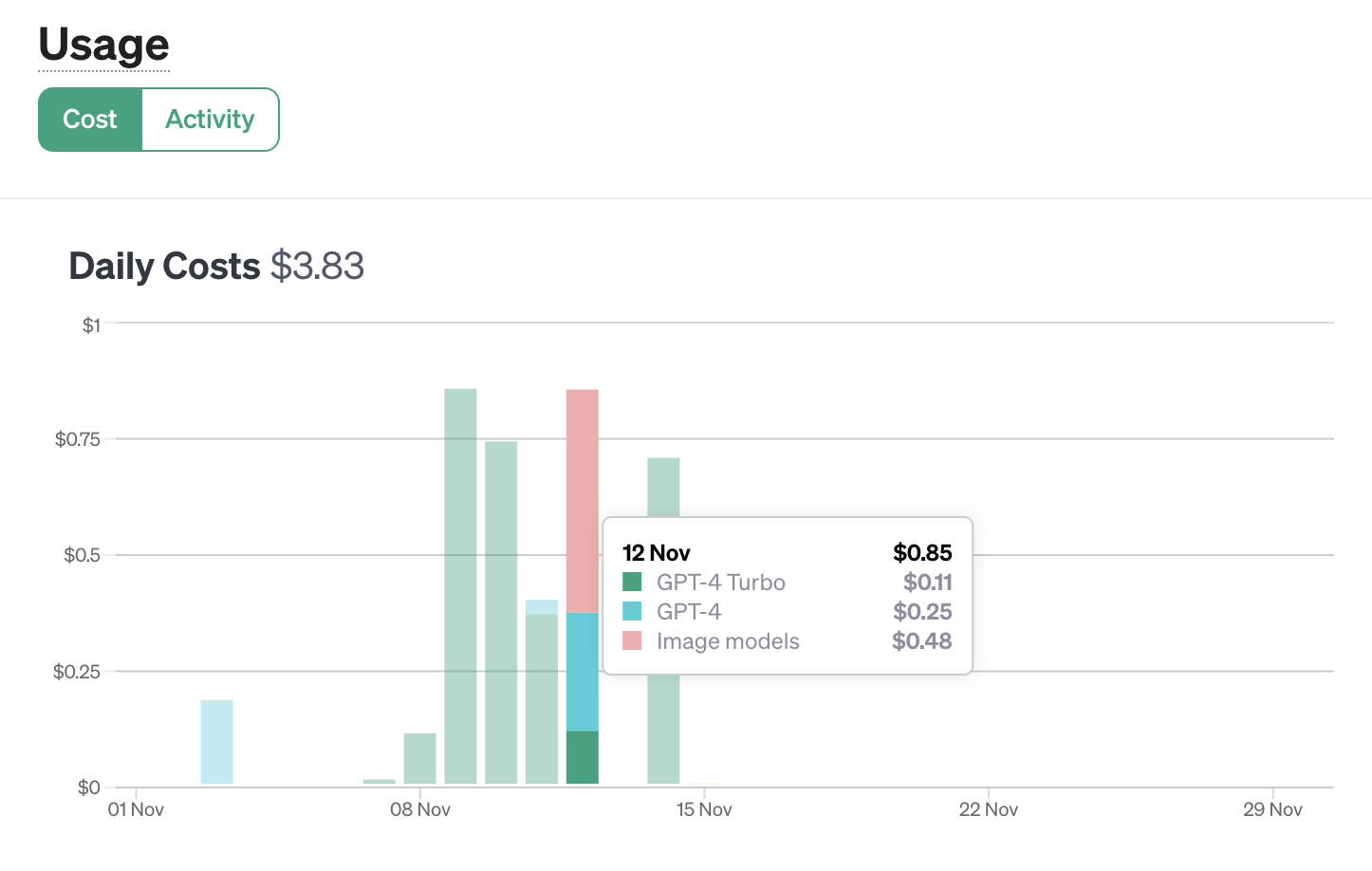 この例では、11月12日に、私のAPIキーで、「GPT-4 turbo」が0.11ドル、「GPT-4」が0.25ドル、画像生成の「DALL-E 3」が0.48ドル分使用されていることがわかる。