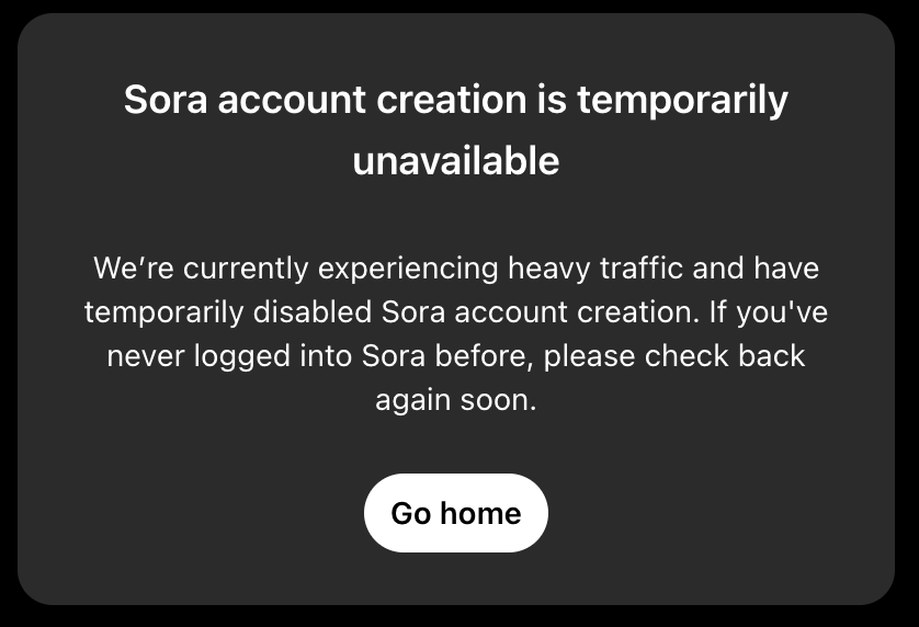 ただし、発表直後から、アクセスが殺到して、現在はSoraのアカウント作成が制限されており、ログインしても以下のようなメッセージが表示される。