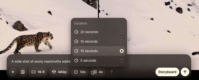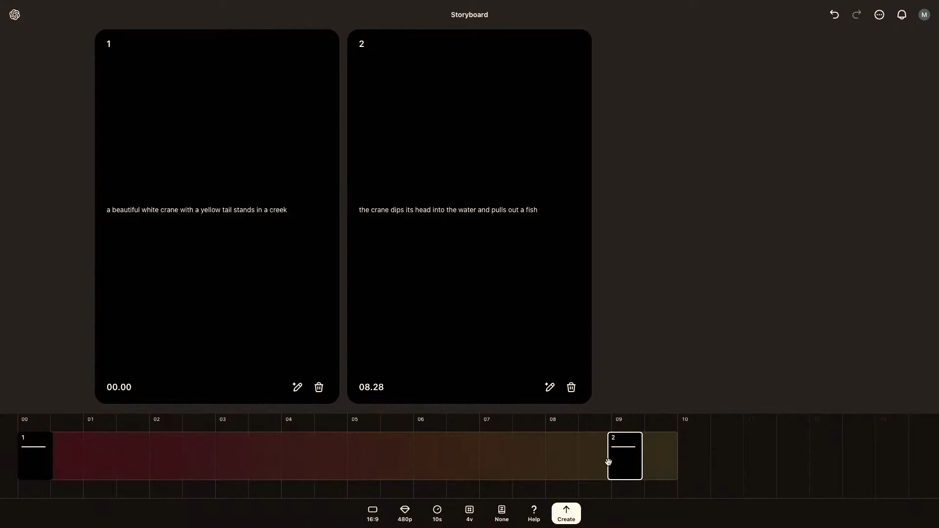 白鳥が立っているシーンから、白鳥が水に顔を沈めて魚を撮るシーンに移り変わる、というような、複数のアクションを時系列で指定して動画を生成できる機能が Storyboard(ストーリーボード) だ。