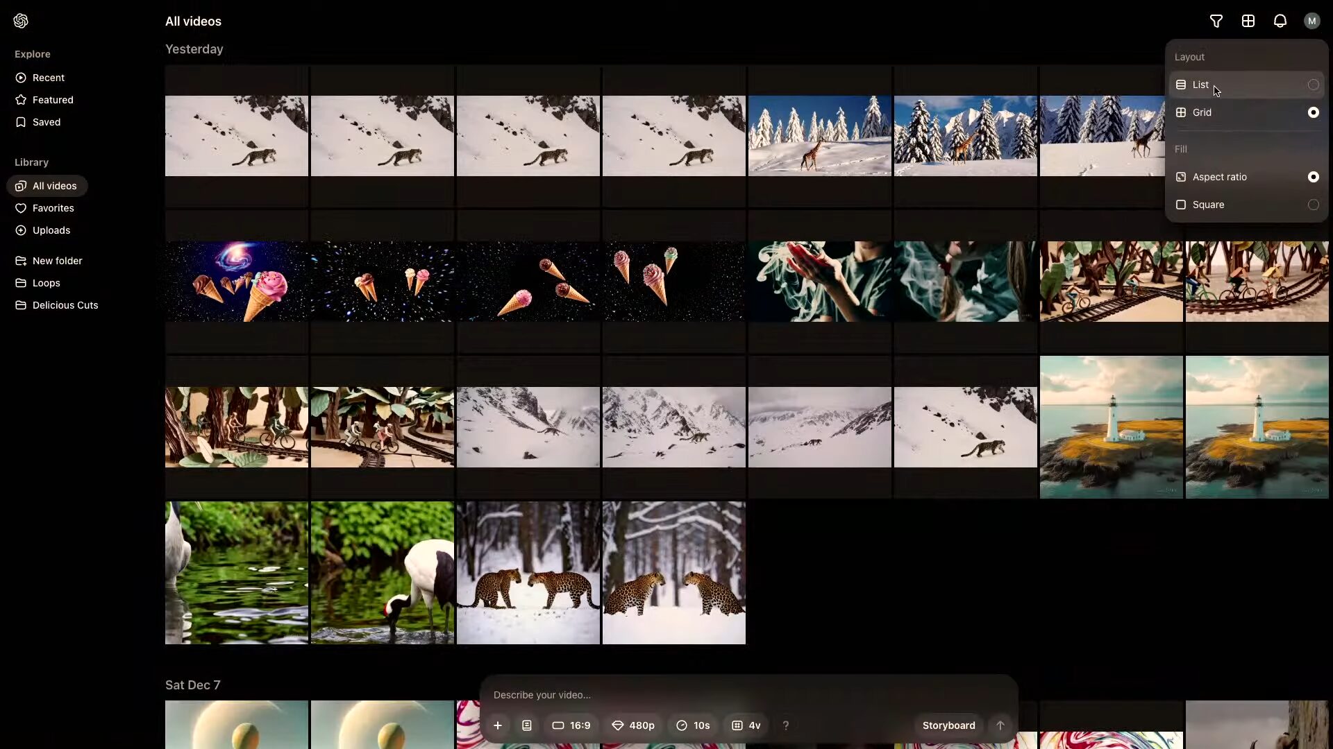 また、Library(ライブラリ) では、ユーザーが生成した動画を管理する画面だ。生成した動画をグリッド/リスト表示できたり、フォルダ管理、ブックマーク、お気に入り機能などの基本的な管理ツールが揃っている。