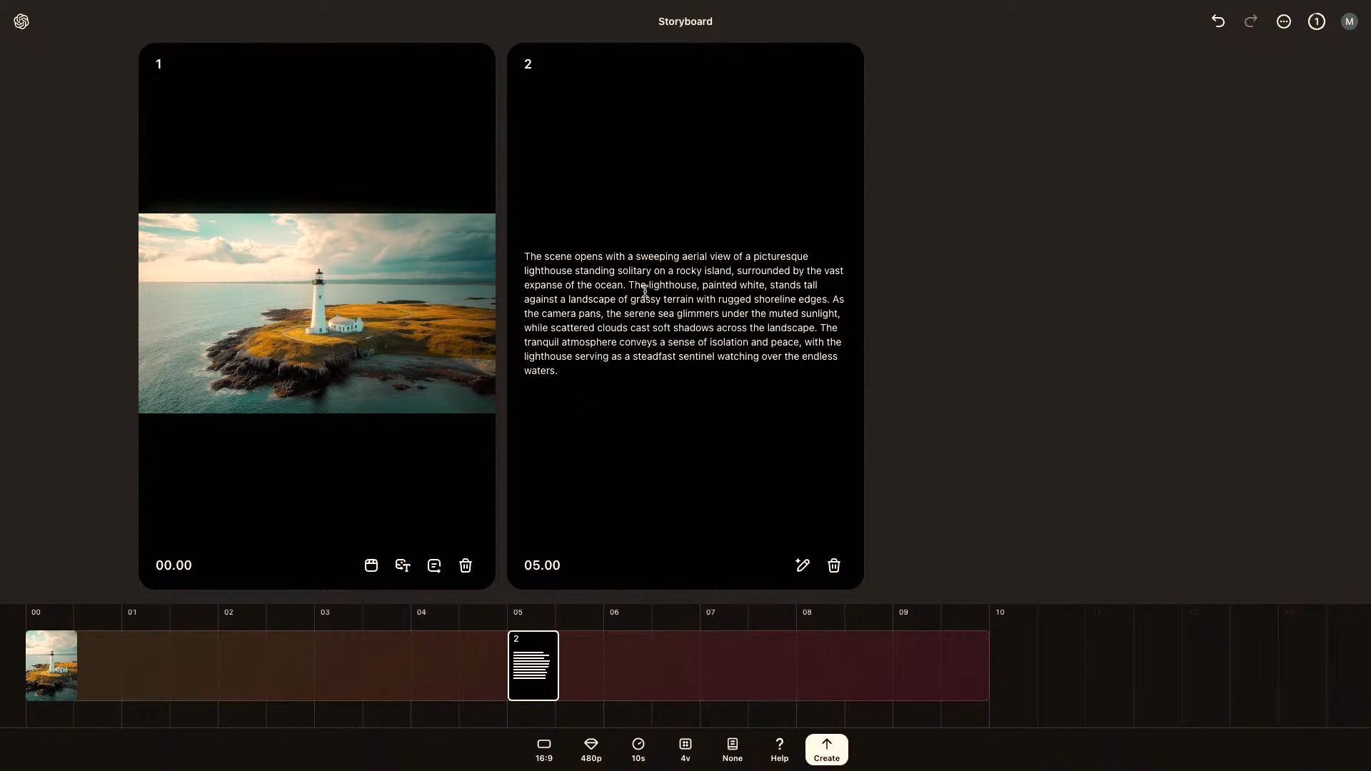 Storyboardのインターフェース上では、生成したいシーンを「カード」形式で並べ、それを動画のタイムラインに配置することで、ストーリーの構成を作ることができる。