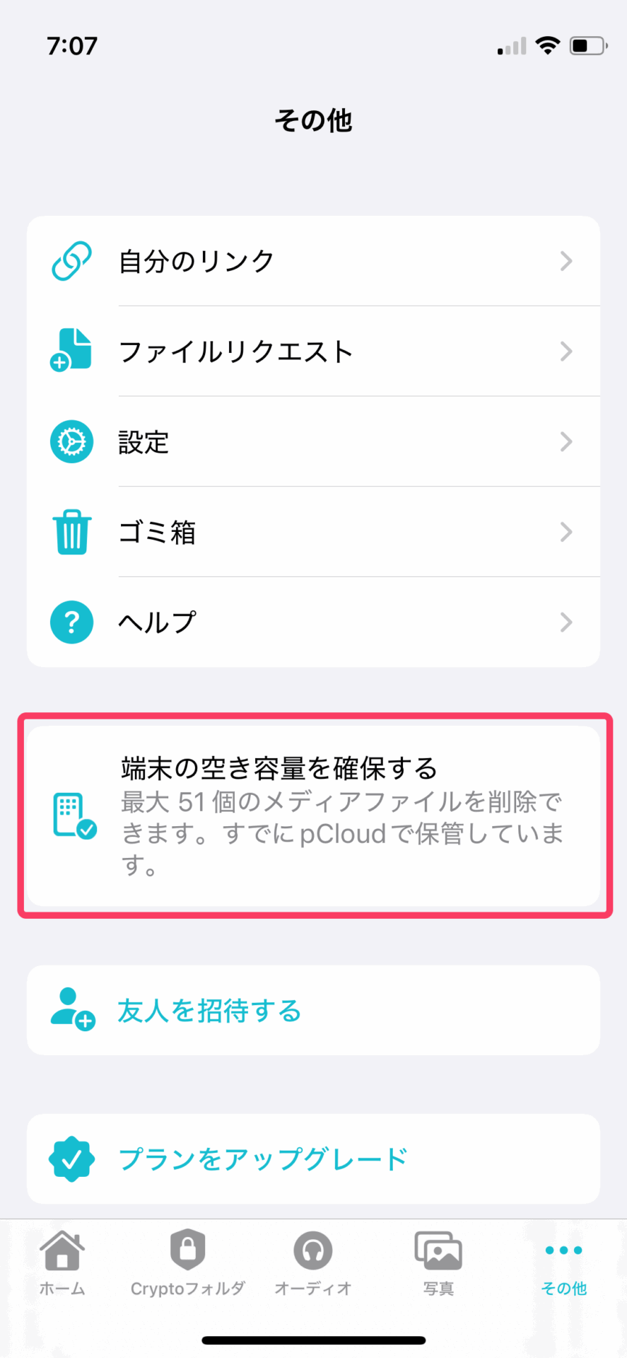 pCloudへのアップロードが完了したメディアファイルは、自動で削除する機能もあり、iPhone本体やAndroid本体の容量を節約できる。