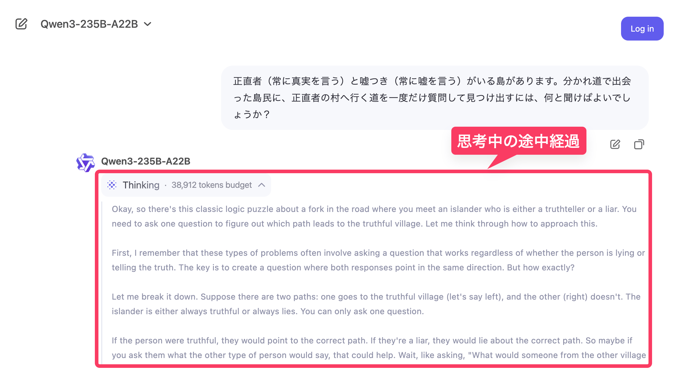 推論モードをオンにすると(/think )、結論を出す前に、モデルが自問自答を繰り返して”考えて”から、最終的な回答を生成する。