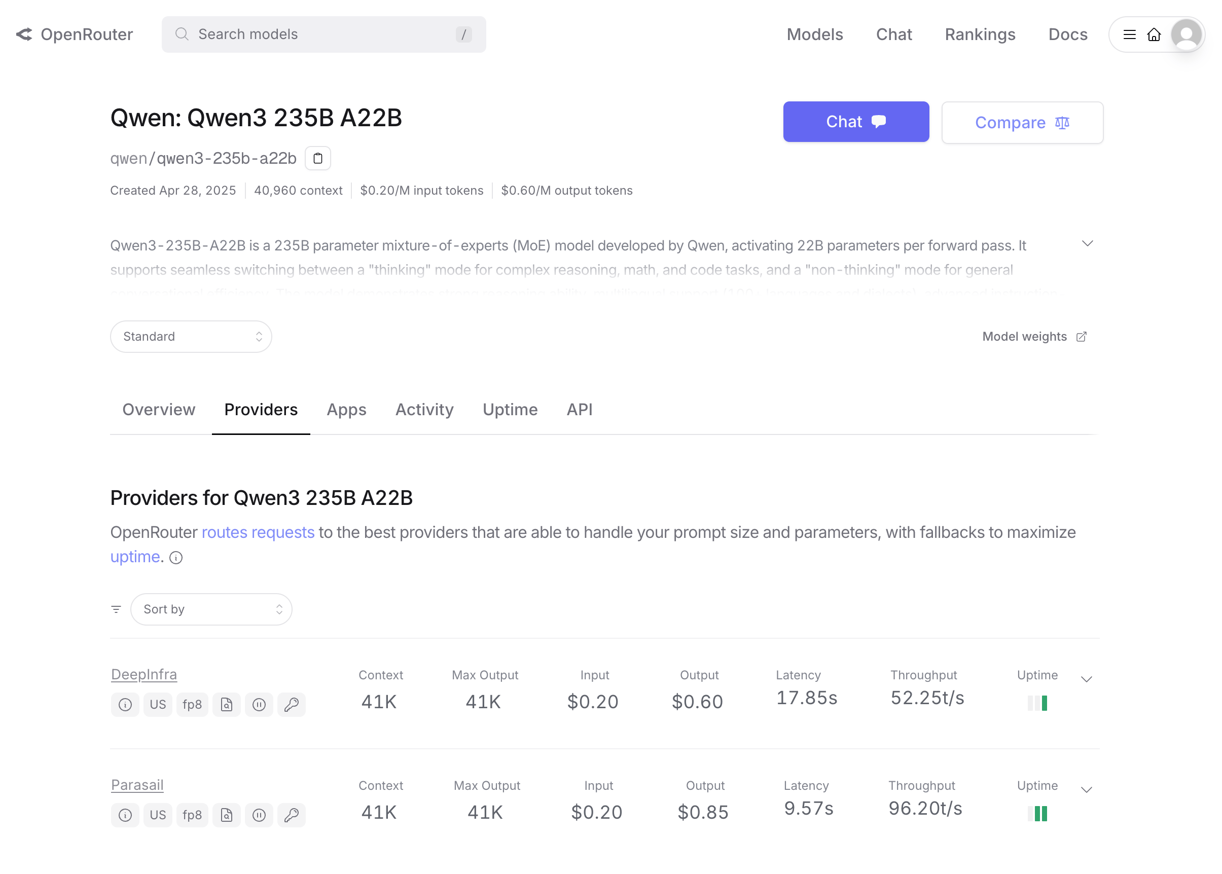 記事執筆現在(4月29日)、OpenRouterで「Qwen3 235B A22B」のプロバイダを確認すると、米国のクラウドコンピューティングサービスである「Deepinfra」や「Parasail」経由で利用できるようになっている。